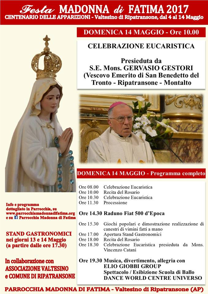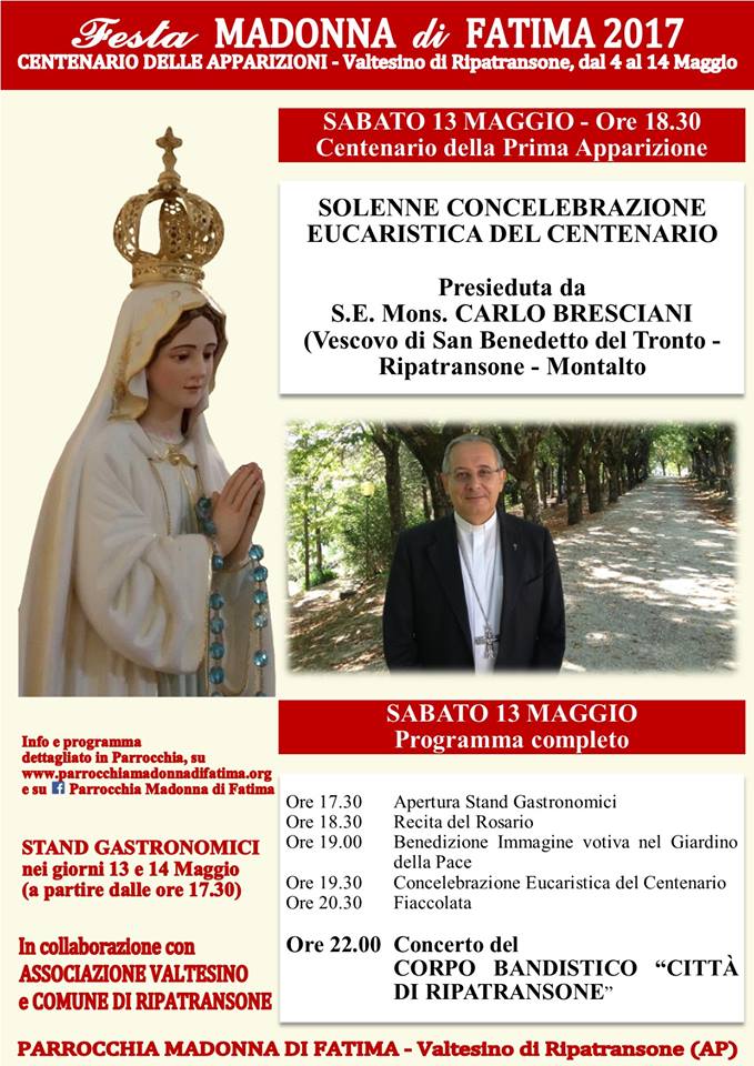 Sarà sicuramente la serata ideale, quindi, per prepararsi alla grande Festa di domani, Sabato 13 Maggio, per il Centenario della prima apparizione di Maria a Fatima con la Solenne Concelebrazione Eucaristica presieduta dal nostro Vescovo Carlo Bresciani, e con gli altri appuntamenti in programma nella stessa serata e nelle giornata di Domenica 14.