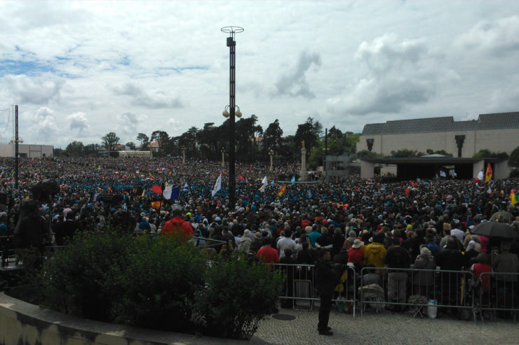 Dopo la visita alla Cappella della base aerea di Monte Reale, Francesco ha raggiunto in elicottero lo Stadio di Fàtima. Al suo arrivo è stato accolto dal Vescovo di Leiria-Fatima, mons. Antonio Augusto dos Santos Marto, dal sindaco della città e da numerosi pellegrini provenienti da tutto il mondo. Il Santo Padre si è poi trasferito in auto — rigorosamente scoperta — al Santuario di Nostra Signora di Fatima, per visitare la “Capelinha das Aparições” (Cappellina delle Apparizioni) dove è stato accolto dal Rettore del Santuario mariano.