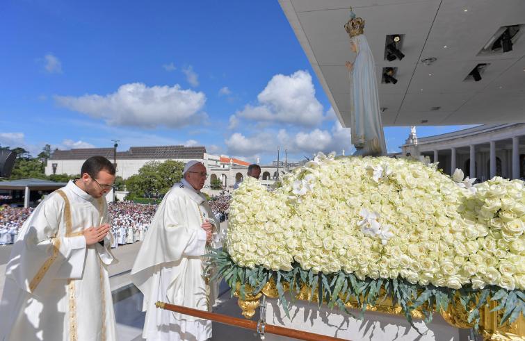 “Abbiamo una Madre”. Lo ha ripetuto tre volte, una delle quali a braccio, Papa Francesco, durante l’omelia della Messa celebrata nella spianata della basilica di Nostra Signora del Rosario di Fatima. Davanti a lui, 500mila persone che poco prima avevano sentito proclamare santi Francesco e Giacinta Marto, i due pastorelli di Fatima che sono diventati i primi due santi bambini non martiri della storia della Chiesa. Altrettanto sterminata la folla che la sera prima, dopo la preghiera privata nella “Cappellina delle Apparizioni” – circa dieci minuti, in piedi, in silenzio davanti alla statua della “Signora”, una delle istantanee più commoventi del suo 19° viaggio apostolico internazionale – aveva ascoltato il primo discorso pubblico del Papa, dopo le benedizioni delle centinaia di migliaia di candele che hanno rischiarato la notte. Molto intenso e prolungato anche il commiato del Papa, che al termine della Messa, come tutti gli altri fedeli, ha agitato commosso il fazzoletto bianco, per salutare la statua della Madonna di Fatima mentre veniva portata via dal palco
