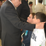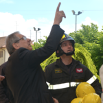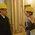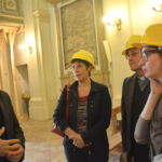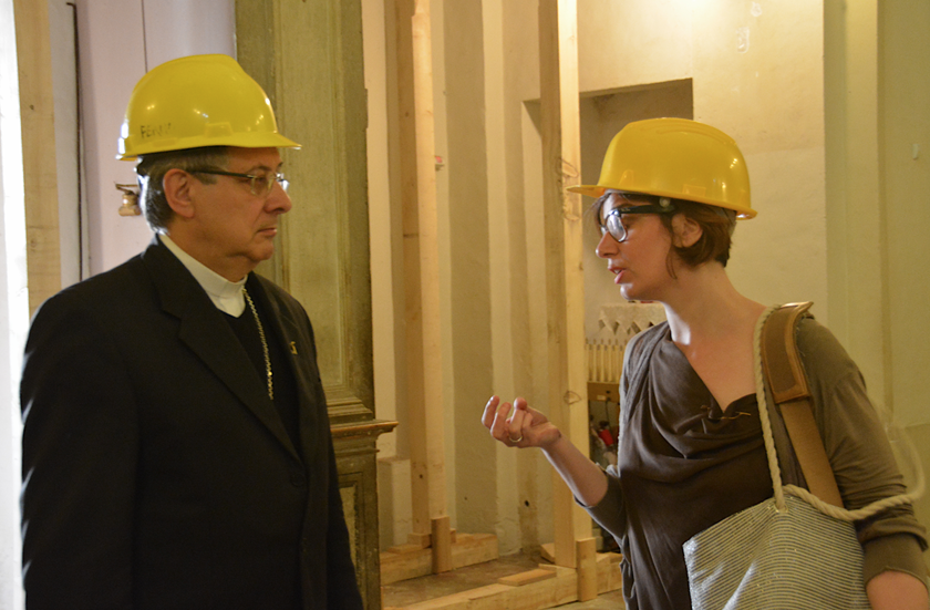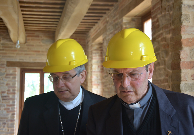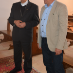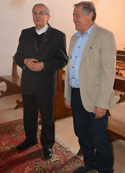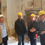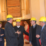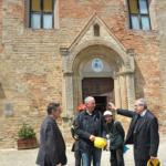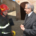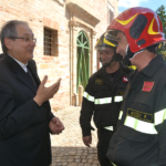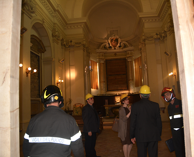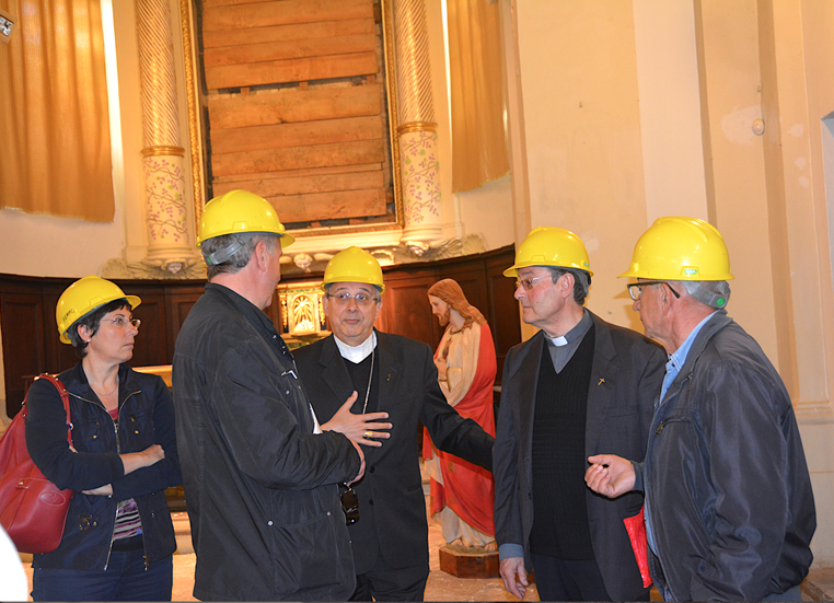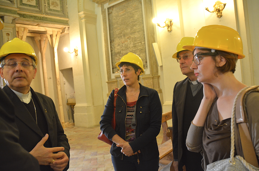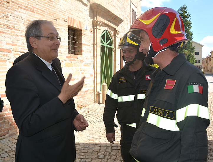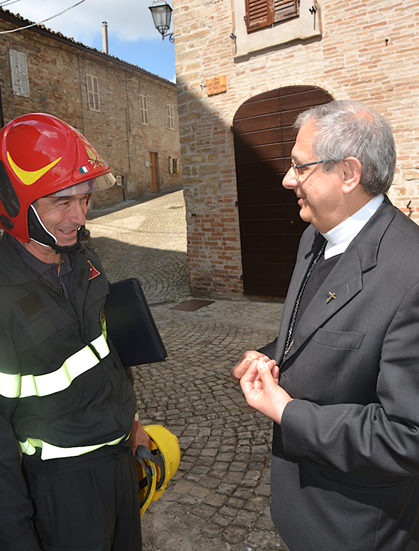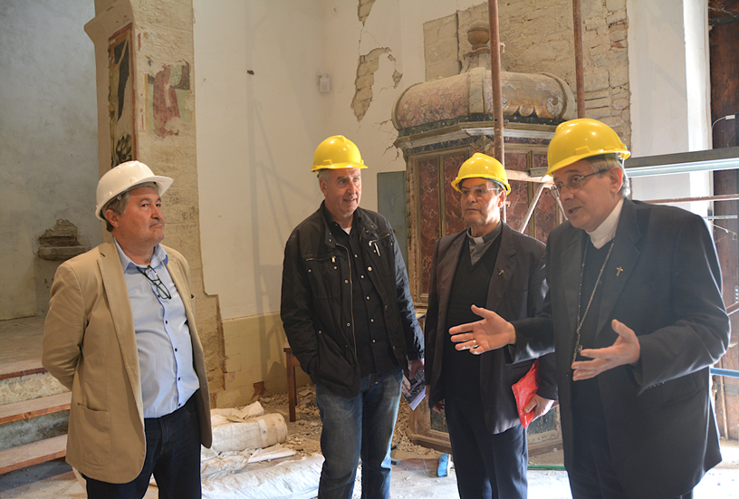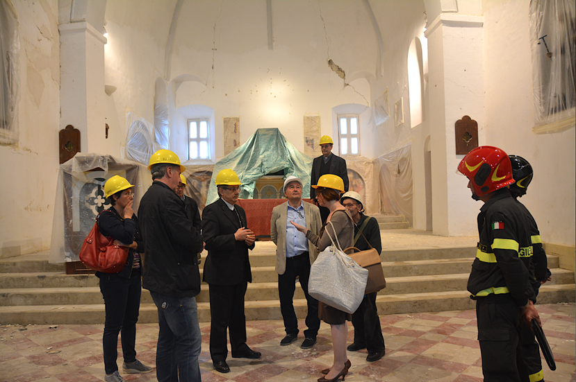 E’ stato ricevuto dal Priore Parroco di San Michele Arcangelo di Montelparo, padre Agostino Maiolini, dal suo vice, Padre Giovanni Mazzoni, dal Sindaco, Marino Screpanti, dall’Archivista Parrocchiale, Letizia Ferracuti, dal Presidente dell’Associazione Culturale Il Murello, Giuseppe Mariucci, dal sagrestano, Pasqualino Pallotti, dal “poule tecnico” incaricato dalla parrocchia, Arch. Fausta del Bianco-Ing. Sergio Citeroni-Geom Francesco Servili, e, (obbligatoriamente considerato che si dovevano visitare gli interni delle chiese montelparesi disastrate dal sisma) da due disponibilissimi Vigili del Fuoco di Ascoli Piceno che fornivano a tutto il gruppo i caschi, anche quelli obbligatori, da indossare negli interni!