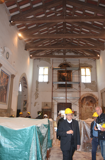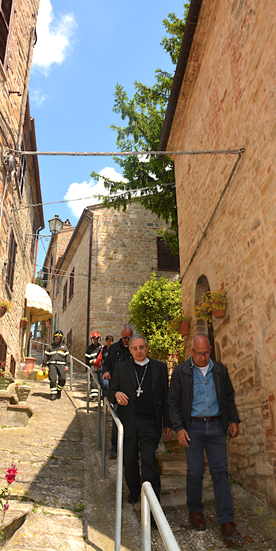 Con la sua consueta disponibilità e affabilità, il Vescovo Carlo si è subito dimostrato curioso e interessato proponendo tante domande, a chi lo seguiva con lo scopo di dare una risposta a quelle domande, visibilmente preoccupato per il penoso stato delle Chiese montelparesi, tutte inesorabilmente chiuse e impraticabili!