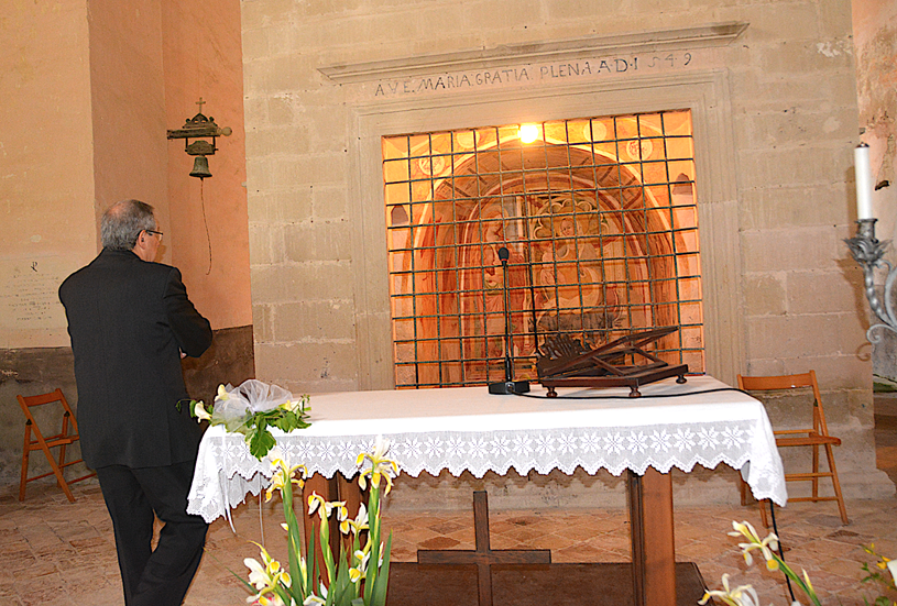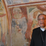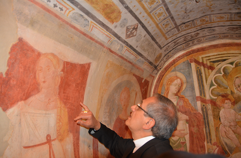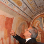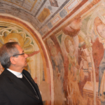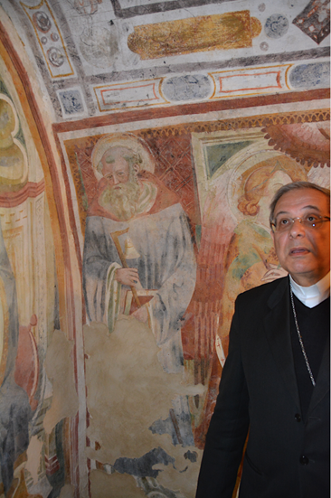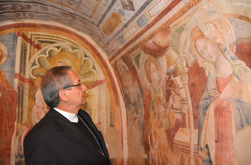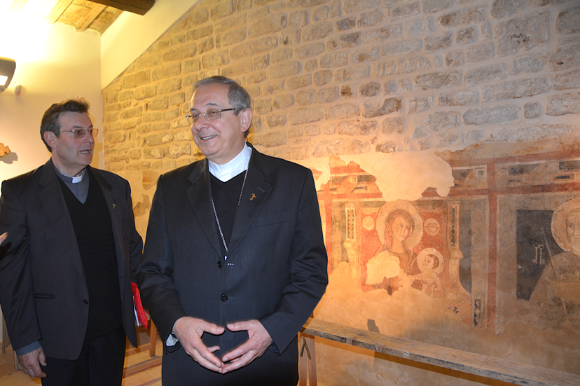 Dopo aver riguadagnato il centro del paese con una discesa tra le sue splendide viuzze, tutti in macchina verso l’ultimo gioiello da visitare: il Santuario Agreste di Santa Maria in Camurano! Grande meraviglia nel Vescovo Carlo, che il luogo non conosceva, di trovarsi di fronte ad una costruzione tanto particolare quanto meditativa! La sua cappellina, con i meravigliosi affreschi, era però l’osservata speciale!