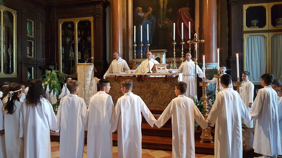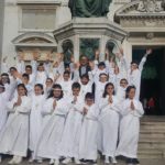 I bambini che domenica 14 maggio ad Acquaviva Picena hanno ricevuto il Sacramento della Prima Comunione si sono recati nel pomeriggiodi ieri, insieme al loro parroco don Alfredo, ai genitori e alle educatrici alla Basilica della Santa Casa a Loreto, uno dei maggiori santuari mariani del mondo, dove hanno ricevuto la seconda Comunione. La Messa è stata celebrata da don Alfredo nella Sala Arancio, sala legata ad una particolare storia che ai bambini è stata spiegata da un frate cappuccino del santuario. Dopo la Messa tutti si sono recati nella Santa Casa e in ginocchio hanno percorso i “Solchetti” intorno alle sue mura, scavati nel marmo dai pellegrini. I bambini nelle loro preghiere hanno ricordato anche le loro famiglie, i loro nonni e gli altri bambini nel mondo.