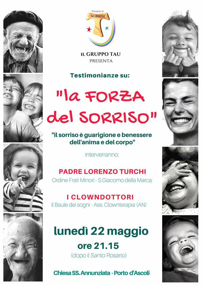 SAN BENEDETTO DEL TRONTO – Si chiama “La forza del sorriso” il progetto voluto dal “Gruppo Tau”, un’organizzazione religiosa costituita da un insieme di ragazzi che condividono un cammino sulle orme dell’insegnamento cattolico ed hanno come obiettivo quello di essere attivi nella società in cui vivono attraverso la cura e l’aiuto del prossimo. L’incontro avrà luogo lunedì 22 maggio alle ore 21,15 presso la Chiesa SS. Annunziata di Porto d’Ascoli.