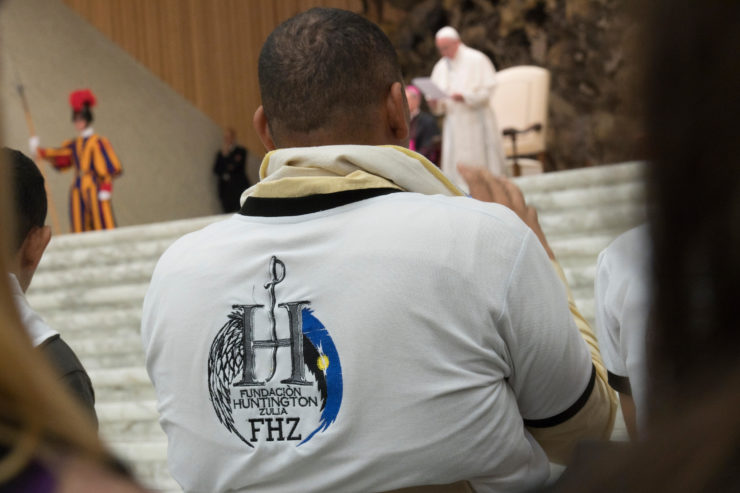 E mi rivolgo a voi, medici, operatori sanitari, volontari delle associazioni che si occupano della malattia di Huntington e di chi ne è affetto. Tra voi ci sono anche gli operatori dell’Ospedale Casa Sollievo della Sofferenza, che, sia con l’assistenza sia con la ricerca, esprimono il contributo di un’opera della Santa Sede in questo ambito così importante. Il servizio di tutti voi è prezioso, perché è certamente dal vostro impegno e dalla vostra iniziativa che prende forma in modo concreto la speranza e lo slancio delle famiglie che si affidano a voi. Le sfide diagnostiche, terapeutiche e assistenziali che la malattia propone sono tante. Che il Signore possa benedire il vostro lavoro: possiate essere punto di riferimento per i pazienti e i loro familiari, che in diverse circostanze si trovano a dover affrontare le già dure prove che la malattia comporta, in un contesto socio-sanitario che spesso non è a misura della dignità della persona umana. Così però le difficoltà si moltiplicano. Alla malattia spesso si aggiungono la povertà, le separazioni forzate e un generale senso di smarrimento e di sfiducia. Perciò le associazioni e le agenzie nazionali e internazionali sono vitali. Siete come braccia che Dio usa per seminare speranza. Siete voce che queste persone hanno per rivendicare i loro diritti!