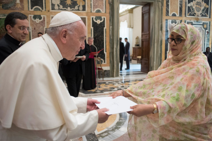 sono lieto di accogliervi in occasione della presentazione delle Lettere che vi accreditano come Ambasciatori straordinari e plenipotenziari dei vostri rispettivi Stati presso la Santa Sede: Kazakhstan, Mauritania, Nepal, Niger, Sudan, Trinidad e Tobago. Uno speciale benvenuto alla Signora M’Haiham, primo Ambasciatore della Mauritania presso la Santa Sede. Vi sarò grato se vorrete trasmettere ai Capi di Stato dei vostri Paesi i miei sentimenti di gratitudine e rispetto, accompagnati dall’assicurazione delle mie preghiere per le loro persone e i popoli che essi rappresentano.