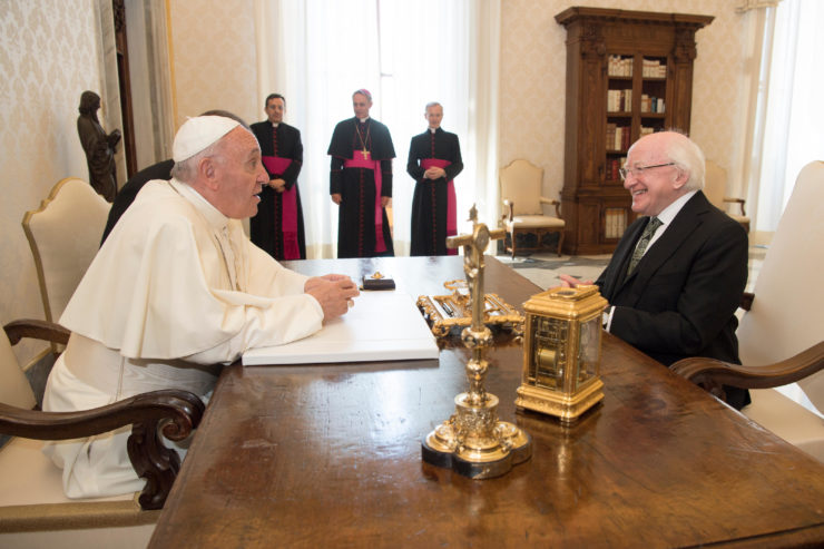 Papa Francesco ha ricevuto ieri, lunedì 22 maggio 2017, il presidente della Repubblica d’Irlanda, Michael D. Higgins, in udienza in Vaticano. Dopo l’udienza privata con il Pontefice, durata circa un quarto d’ora, il politico e poeta settantaseienne ha incontrato il cardinale di Stato, Pietro Parolin, che era accompagnato dal segretario per i Rapporti con gli Stati, mons. Paul Richard Gallagher.