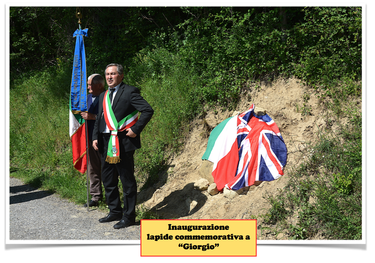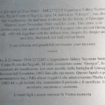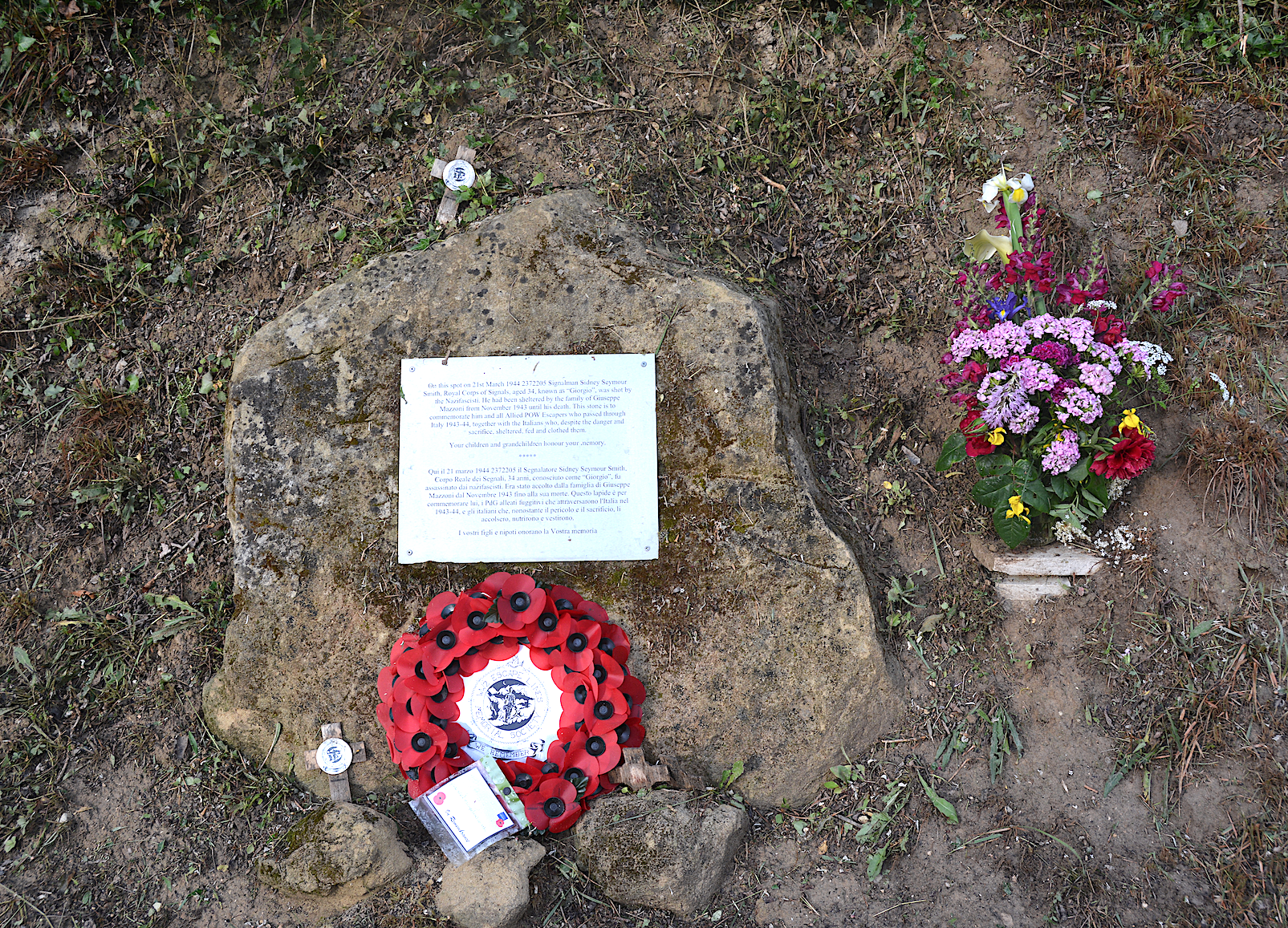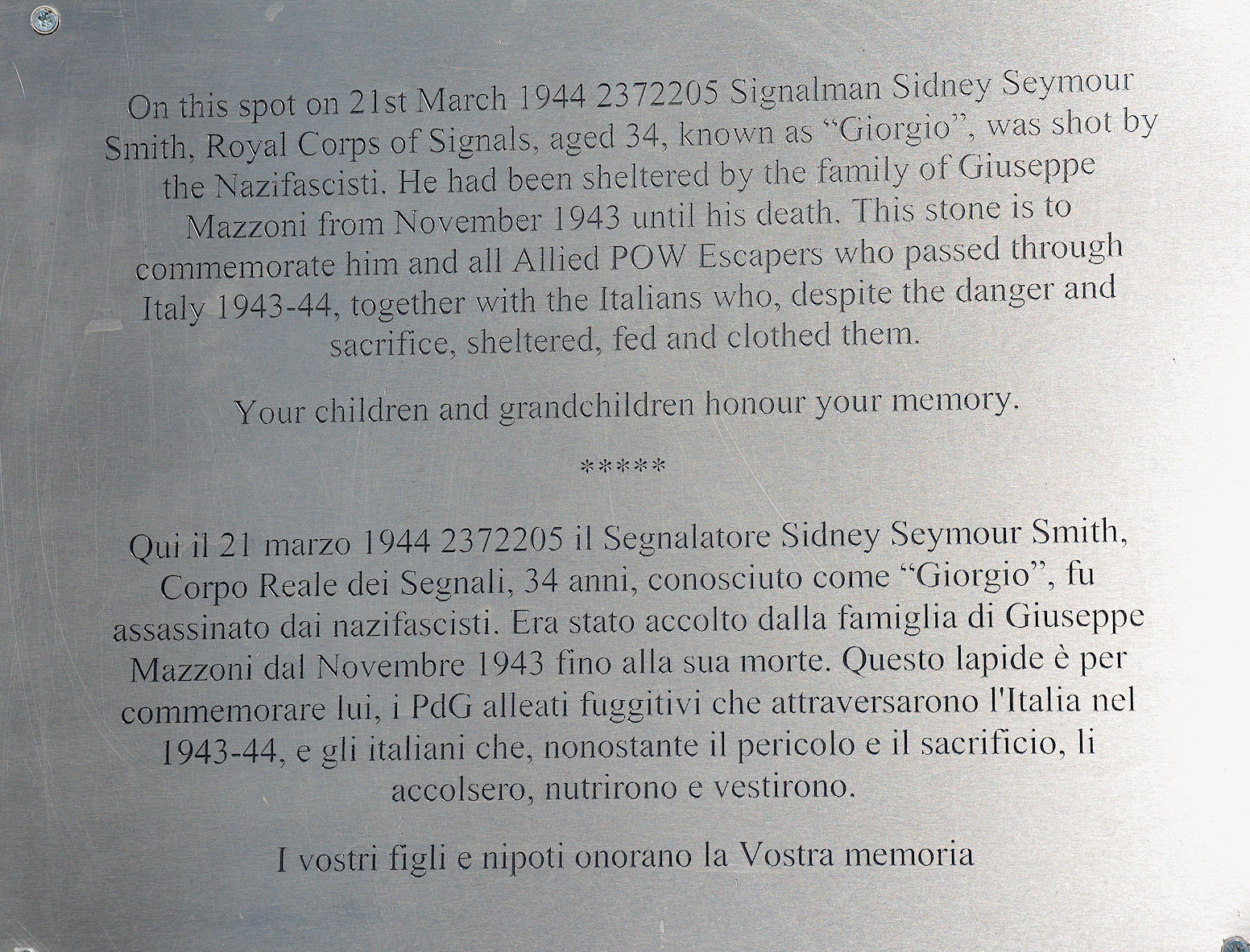 “In questo luogo il 21 Marzo 1944 2.372.205 Signalman Sidney Seymour Smith, il Royal Corps of Signals, 34 anni, conosciuto come “Giorgio”, fu assassinato dai nazifascisti. Era stato accolto dalla famiglia di Giuseppe Mazzoni dal novembre 1943 fino alla sua morte. Questa lapide è per commemorare lui, i PdG alleati fuggitivi che attraversarono l’Italia nel 1943-1944, e gli italiani che, nonostante il pericolo e il sacrificio, li accolsero, nutrirono e vestirono. I vostri figli e nipoti onorano la Vostra memoria”.