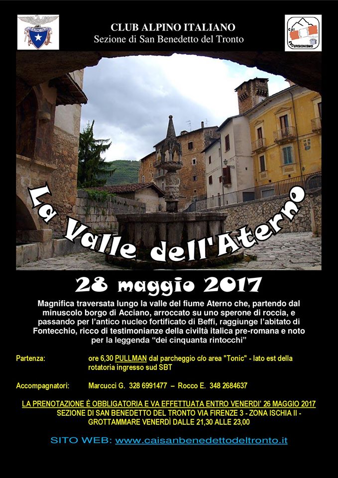 Per domenica prossima 28 maggio 2017 il Programma del CAI Sezione di San Benedetto del Tronto prevede una traversata molto interessante nella “VALLE dell’ATERNO“, sul versante settentrionale del Gruppo del Sirente: magnifica traversata lungo la valle del fiume Aterno che, partendo dal minuscolo borgo di Acciano, arroccato su uno sperone di roccia, e passando per l’antico nucleo fortificato di Beffi, raggiunge l’abitato di Fontecchio, ricco di testimonianze della civiltà italica pre-romana e noto per la leggenda “dei cinquanta rintocchi”.
