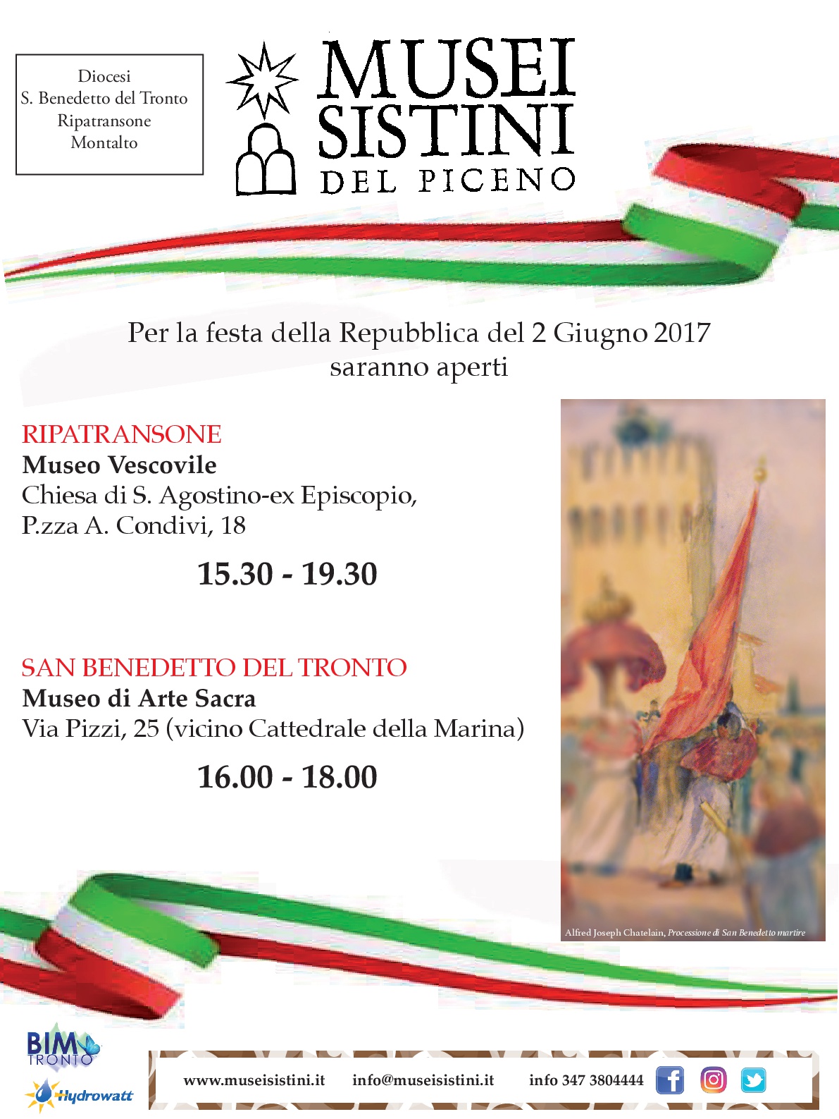 DIOCESI –  La diocesi di San Benedetto del Tronto – Ripatransone – Montalto informa che per la festa della Repubblica del 2 Giugno i Musei Sistini del Piceno rimarranno aperti nei seguenti orari: