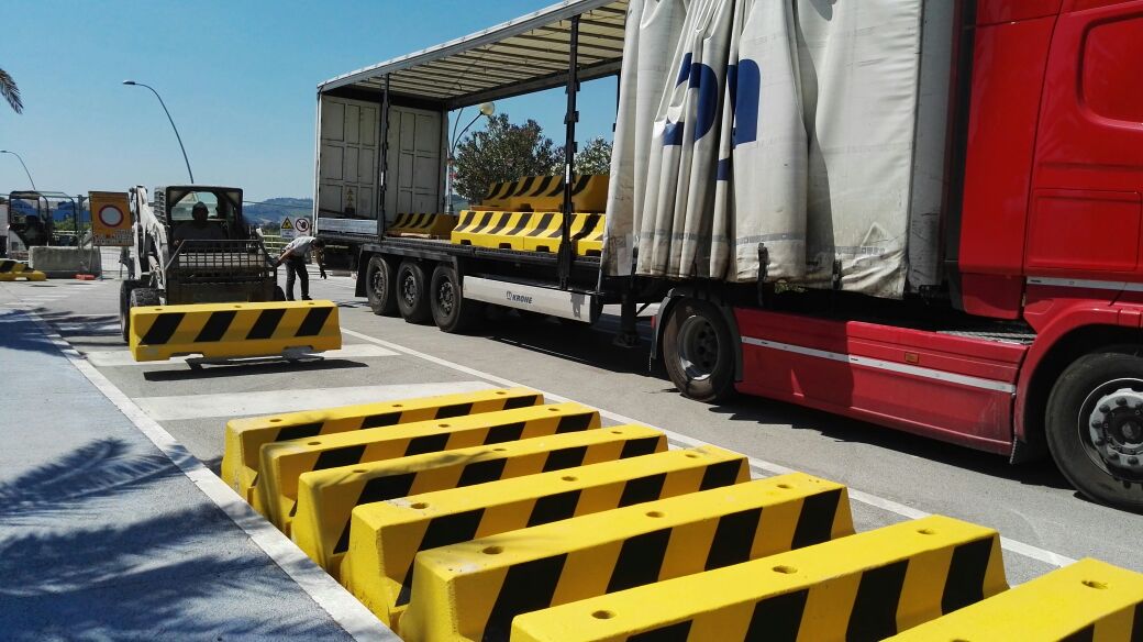 GROTTAMMARE – Il primo carico di materiali stradali propedeutici alla riapertura del ponte del lungomare De Gasperi è arrivato questa mattina da Pisa: un tir ha scaricato una parte dei mini new jersey che dovranno garantire il rafforzamento delle protezioni laterali del ponte. In tutto, ne servono 159 che la ditta produttrice fornirà in 5 consegne.