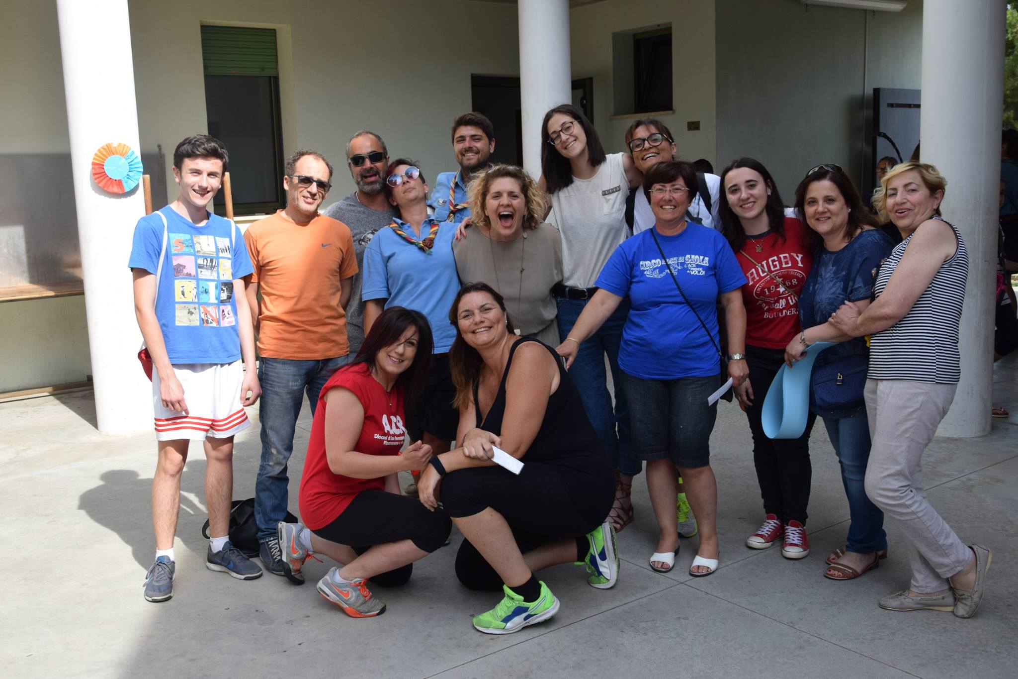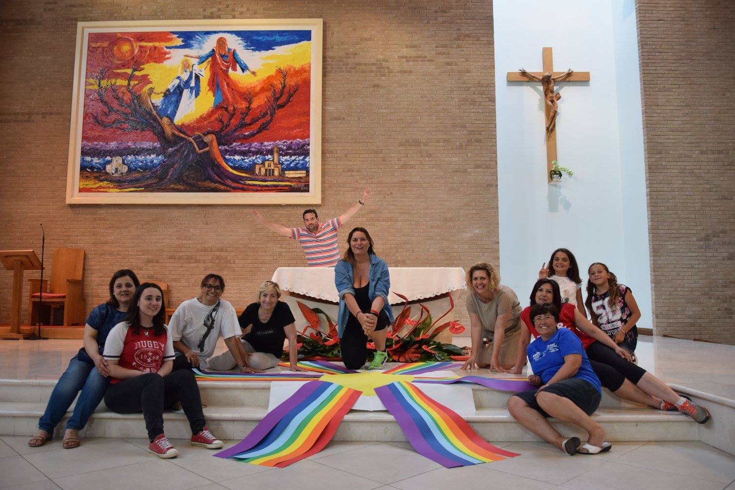 Sette squadre si sono avvicendate nei sette stand di gioco dislocati nelle zono all’aperto della parrocchia, quali campetto, prato e zone più ombreggiate. Al termine di ogni gioco ogni educatore a capo dello stand consegnava alla squadra una fascia colorata. Terminati i giochi ogni squadra aveva sette fasce con i colori dell’arcobaleno che sono state incollate come raggi attorno ad un grande sole: il sole indica la chiesa da cui dipartono le persone che costituiscono insieme una comunità eterogenea ma unita.