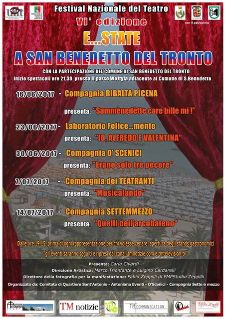 SAN BENEDETTO DEL TRONTO – Anche quest’anno la Compagnia Teatrale “Gli O’Scenici”, la Compagnia “Settemmezzo”, l’Associazione Antoniana Eventi e il Comitato di Quartiere Sant’Antonio, con il patrocino del comune di San Benedetto del Tronto, della provincia di Ascoli Piceno e della regione Marche, organizzano il Festival Nazionale del Teatro –“E…state a San Benedetto del Tronto” 2017