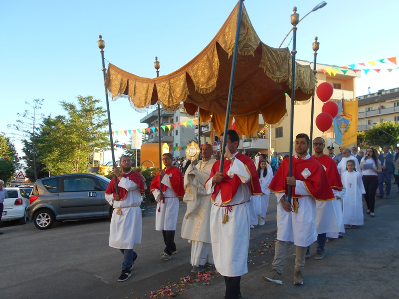 ACQUAVIVA PICENA –Ad Acquaviva Picena domenica 18 giugno alle ore 18:00 si è svolta la santa Messa e Processione del Corpus Domini. Il parroco don Alfredo ha scelto di celebrare l’Eucarestia all’aperto e per di più in una zona periferica per abbracciare simbolicamente tutto il paese e far meglio comprendere che la chiesa deve essere in “uscita” come ricorda Papa Francesco. Nell’omelia don Alfredo ha detto: “La festa del Corpus Domini si riallaccia al giovedì Santo, ma in quell’occasione ricordiamo che Gesù era con i Dodici, ora Gesù ci vuole ricordare che Egli è Pane Vivo per tutta l’umanità. Egli ci ricorda che solo Lui è il vero cibo che può donare la vita eterna. Ricordiamoci poi anche di tutti quelli che non hanno nulla da mangiare, mentre ci sono altri che non hanno rispetto per i doni di Dio, non hanno rispetto per il Creato. Un rispetto di cui ognuno di noi è responsabile. Oggi vorrei pregare anche per i maturandi e per tutti coloro che in questo anno pastorale si sono adoperati con carità per la Chiesa o per qualche bisognoso”. Terminata la Celebrazione Eucaristica si è snodata la solenne processione con la presenza di tutte le confraternite e della comunità. In piazza san Niccolò don Alfredo ha impartito la benedizione col Santissimo Sacramento.