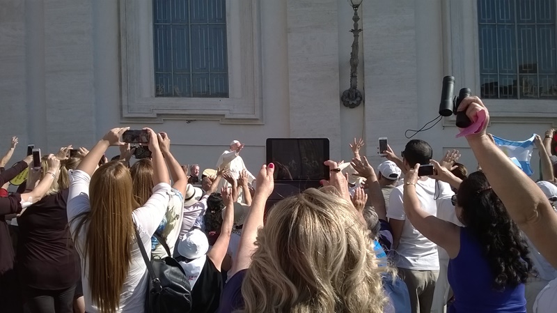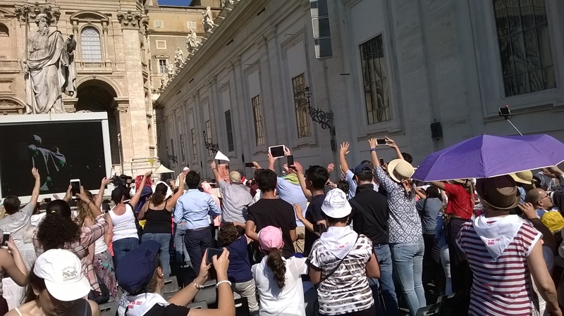 ACQUAVIVA PICENA – Mercoledì, 21 giugno, è stato il ventesimo anniversario di ordinazione presbiterale di don Alfredo Rosati. Il parroco di Acquaviva ha voluto celebrare questo speciale anniversario organizzando una giornata per i propri parrocchiani a Roma e, con l’occasione, partecipare all’udienza settimanale con Papa Francesco. Arrivati nei pressi di Città del Vaticano, il gruppo si è diretto in piazza San Pietro e, dopo aver passato i controlli di routine, si è accomodato in attesa dell’inizio dell’udienza. Il Santo Padre non si è fatto attendere molto; al suo arrivo la folla si è alzata in piedi e in molti sono saliti sulle sedie o si sono avvicinati alle transenne per poter seguire il suo consueto percorso tra i settori e poterlo salutare. Durante il suo discorso, Papa Francesco ha richiamato tutti alla santità, cioè a seguire l’esempio della “moltitudine dei testimoni”, come i santi vengono definiti nella Lettera agli Ebrei, una compagnia di fratelli e sorelle maggiori che vivono per sempre nell’abbraccio di Dio, dopo essere passati per la nostra stessa strada, vivendo le nostre stesse fatiche. In ogni momento della vita esiste la mano di Dio e anche la discreta presenza di tutti i credenti che ci hanno preceduti con il segno della fede:”Dio non ci abbandona mai – ha detto il Santo Padre – ogni volta che ne avremo bisogno verrà un suo angelo a risollevarci e a infonderci consolazione; angelo, qualche volta, con un volto e un cuore umano perché i santi di Dio sono sempre qui, nascosti in mezzo a noi”. Parlando dell’invocazione dell’intercessione dei santi durante la celebrazione del sacramento del matrimonio, Papa Francesco, con la semplicità e la schiettezza che lo contraddistinguono dall’inizio del suo pontificato, ha detto:”Chi ama veramente ha il desiderio e il coraggio di dire ‘per sempre’, ma sa di avere bisogno della grazia di Dio e dell’aiuto dei santi per poter vivere la vita matrimoniale per sempre, non, come alcuni dicono, finché dura l’amore. Al contrario è meglio che non ti sposi. O per sempre o niente”.