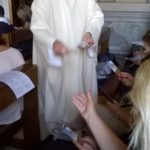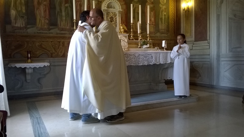 Dopo aver pranzato, don Alfredo, con i suoi parrocchiani, si è recato presso la cappella della Madonna della Fiducia, al Pontificio Seminario Romano Maggiore, per la celebrazione della messa per il suo ventesimo anniversario. L’omelia del parroco è partita dalla riflessione su una frase di San Paolo, nella Seconda lettera ai Corinzi, ‘Ciascuno dia secondo quanto ha deciso nel suo cuore, non con tristezza né per forza, perché Dio ama chi dona con gioia’. Non è importante quanto facciamo, ma che facciamo avendo nel cuore l’intenzione di Dio; è questo che fa trasparire la vera gioia dalle nostre azioni, dando ad esse grande valore, mentre la tristezza viene quando facciamo le cose aspettandoci, in maniera più o meno velata, una ricompensa che non sempre c’è. San Paolo dice, inoltre, che dobbiamo fare in modo che la Parola porti frutto, ma è il Signore che decide i frutti e che sceglie i terreni e tutto quello che facciamo di buono non ha valore se non c’è prima una comunione con il Signore, quindi bisogna curare anche l’aspetto spirituale della nostra vita. Terminata l’omelia, don Alfredo ha consegnato ai partecipanti un segnalibro con una frase che lo ha particolarmente colpito: Essere fedeli è rialzarsi sempre e sempre camminare di M. Quoist e dopo il dono della Parola di don Alfredo ai parrocchiani, i parrocchiani hanno voluto consegnare un dono concreto al proprio parroco, un piccolo pensiero per la sua festa.