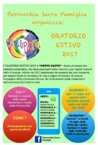 SAN BENEDETTO DEL TRONTO – La Parrocchia sacra Famiglia parte con una nuova avventura, l’oratorio estivo “Detto fatto”. Il tema è la scoperta dell’inizio. La vita dell’uomo è costituita da un susseguirsi ininterrotto di inizi. Ogni inizio è frutto di altri inizi, tranne uno, in quanto ha precedenza assoluta: la creazione. Tornare all’origine significa rinvenire più profondamente il senso vero di tutto ciò che esiste, nella prospettiva dell’armonia, dono di Dio. Durante l’oratorio estivo i ragazzi saranno invitati a condividere lo sguardo di Dio, che «vide che era cosa buona», accogliere la Sua benedizione all’uomo e a tutti gli esseri viventi, adempiere un compito, che Dio identifica come “dominio”. In questo percorso attraverso i giorni della creazione i bambini e ragazzi saranno accompagnati dalla figura di san Francesco d’Assisi, luminoso esempio di ecologia integrale nel riconoscere nella natura l’impronta del creatore. I laboratori manuali, espressivi e di fotografia saranno coordinati da alcune catechiste e dai ragazzi del gruppo giovani. L’oratorio è aperto ai bambini e ragazzi delle classi elementari e medie, dall’11 luglio al 3 agosto tutti i martedì ed i giovedì dalle 16 alle 19. La partecipazione è soggetta ad una quota ad offerta per le spese dei laboratori (info: fb Parrocchia Sacra Famiglia).