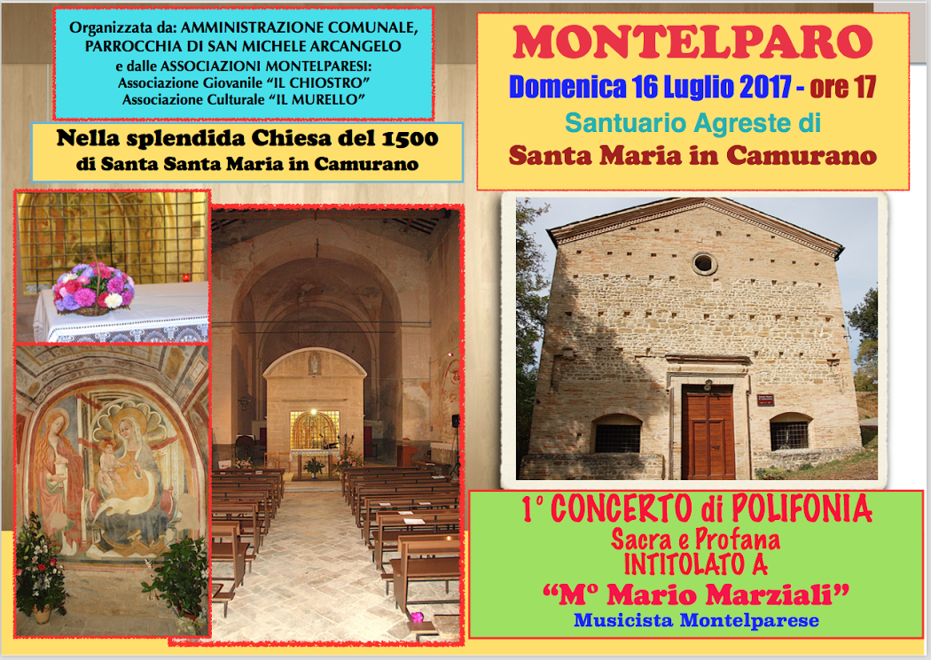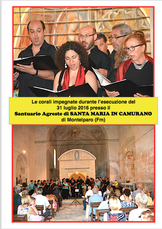 Ritornando al Concerto Polifonico c’è da dire (e per questo si possono consultare le locandine allegate) che, Domenica 16 Luglio 2017 alle ore 17,00 presso il Santuario Agreste di Santa Maria in Camurano di Montelparo, lo stesso sarà rallegrato, con una grande varietà di pezzi, da eccellenti formazioni quali sono:
