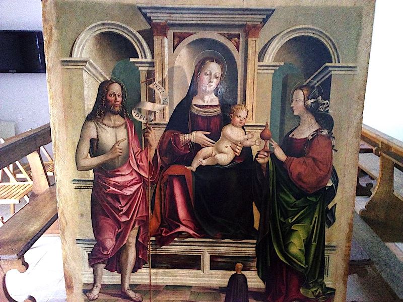 Il dipinto a olio di cui stiamo parlando, e che raffigura appunto “La Madonna in trono con Bambino”, era posto proprio sopra all’altare maggiore di questa chiesa.