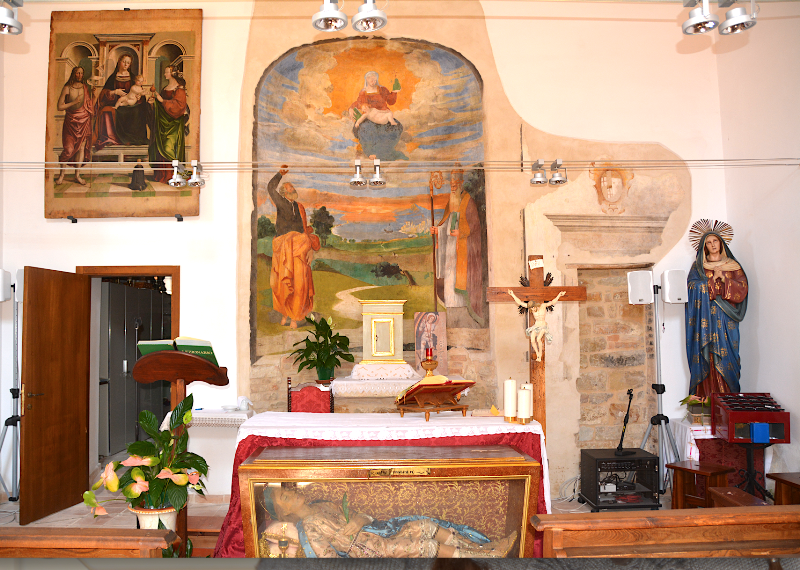Dopo i disastri tellurici, che hanno privato la comunità montelparese dell’uso di tutte le strutture ecclesiastiche di Montelparo tranne quella dei Santi Pietro e Silvestro (già restaurata da quasi un anno e destinata dall’Amministrazione Comunale a Sala Convegni), è tornato a Montelparo, proprio nell’unica Chiesa che poteva ospitarli, il preziosissimo dipinto a olio che raffigura “La Madonna in trono con Bambino”, tra San Giovanni Battista e Maria Maddalena, datato 1515 ed eseguito da Vincenzo Pagani (n. 1480 – m. 1568).