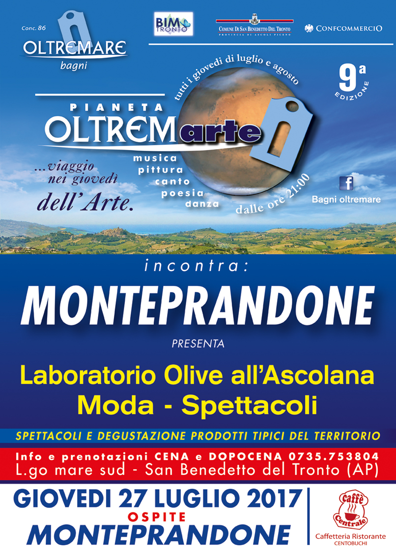 Quest’anno il Comune di Monteprandone farà conoscere la cultura, l’arte e l’enogastronomia. Oltre al laboratorio sulla preparazione dell’oliva all’ascolana con successiva degustazione del prodotto, curato dalla Proloco di Monteprandone e tenuto da massaie monteprandonesi custodi di una tradizione che si tramanda di generazione in generazione, ci sarà la sfilata di moda della stilista Daniela Giobbi.