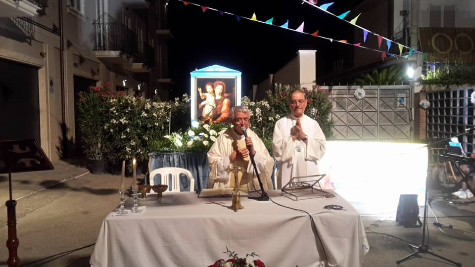 L’ultima domenica di Luglio è solo il momento conclusivo della festa. In realtà da oltre trent’anni la festa inizia due settimane prima con la “Peregrinatio Mariae”, giorni in cui l’immagine della Madonna della Marina cammina per le vie del centro arrivando nelle zone più lontane della parrocchia. Si cammina sgranando le decine del S. Rosario, pregando e cantando. La sera successiva al trasferimento dell’immagine in una delle quattro zone, si vive la Santa Messa in un luogo preparato e addobbato dai parrocchiani. Ho citato all’inizio le strofe del canto perché è significativo ed intenso. Si, Maria chiama gli uomini e le donne, i bambini ed i giovani. Chiama passando tra e nei luoghi del quotidiano. E se cinquanta o anche cento anni fa questo canto evocava immagini consuete di una fede semplice e devota, oggi la sfida è audace e seria.