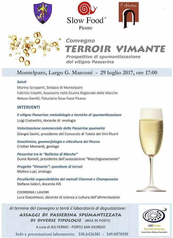 L’interessante evento, ben organizzato dall’associazione “Il Chiostro” di Montelparo con il patrocinio del Comune di Montelparo, il Presidio Slow Food Piceno e dell’Associazione Italiana Sommelier di Fermo e Porto San Giorgio, coordinato da Luca Giacomozzi, montelparese, docente di scienza e cultura dell’alimentazione, voleva promuovere e divulgare l’idea di spumantizzazione del vitigno autoctono Passerina attraverso gli interventi dei vari relatori.