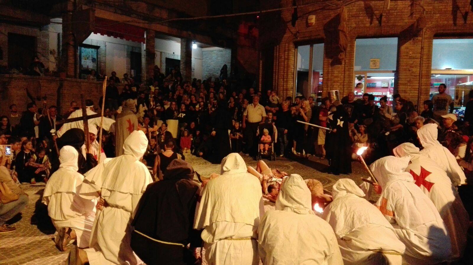 Il centro storico di Castignano si è completamente trasformato: luci, colori, suoni odori, abiti un tuffo nel medioevo. Da lontano si poteva già sentire il suono delle cornamuse e le voci dei meravigliosi artisti che invitavano: “Madame, Messere prego, benvenuti a Templaria”.