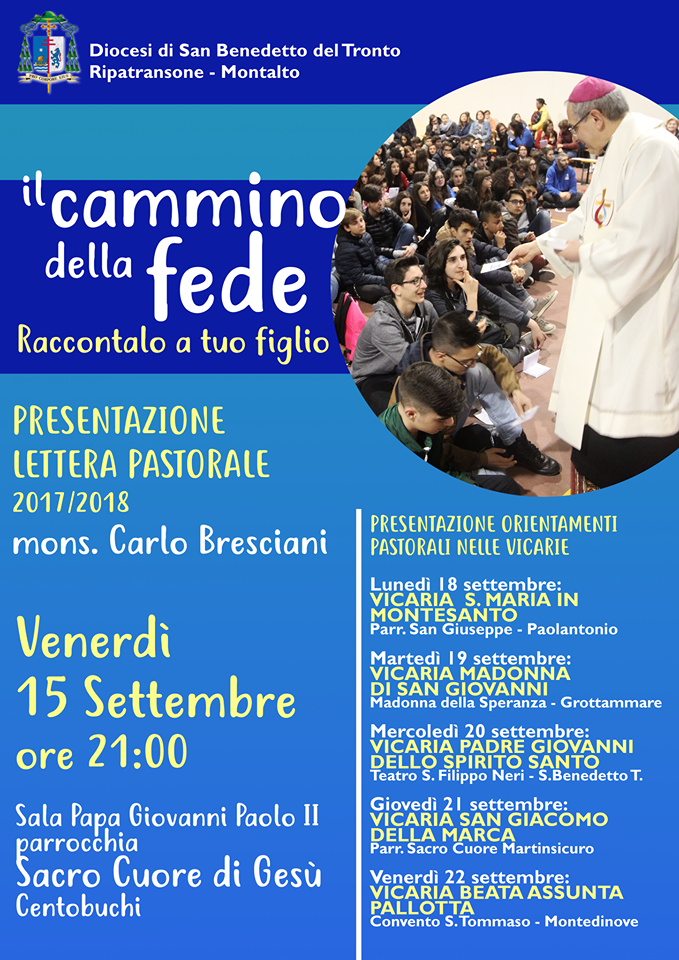 Venerdì 15 settembre alle ore 21.00 presso la sala Papa Giovanni Paolo II della Parrocchia Sacro Cuore in Centobuchi il Vescovo Carlo presenterà alla diocesi la sua lettera Pastorale.