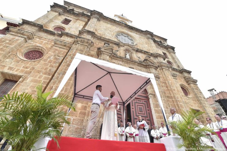 Poco prima di entrare in questa chiesa, dove si conservano le reliquie di san Pietro Claver, ho benedetto le prime pietre di due istituzioni destinate a persone con gravi necessità e ho visitato la casa della signora Lorenza, dove accoglie ogni giorno molti nostri fratelli e sorelle per dare loro cibo e affetto. Questi incontri mi hanno fatto tanto bene perché lì si può toccare con mano l’amore di Dio che si fa concreto, si fa quotidiano.