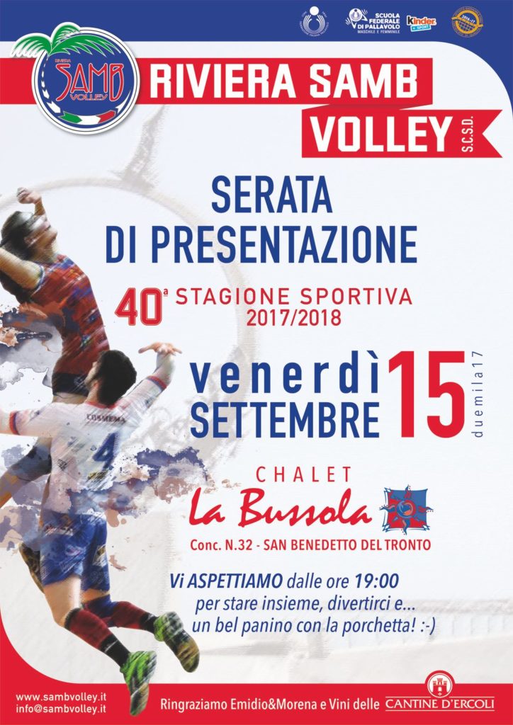 SAN BENEDETTO DEL TRONTO – Lo chalet “La bussola” situato in Lungomare Marconi a San Benedetto del Tronto, concessione 32, ospiterà alle ore 18 di venerdì 15 settembrela conferenza stampa e la presentazione della stagione 2017/18 della Riviera Samb Volley, la 40esima della sua storia, alla presenza dei vertici della pallavolo regionale.