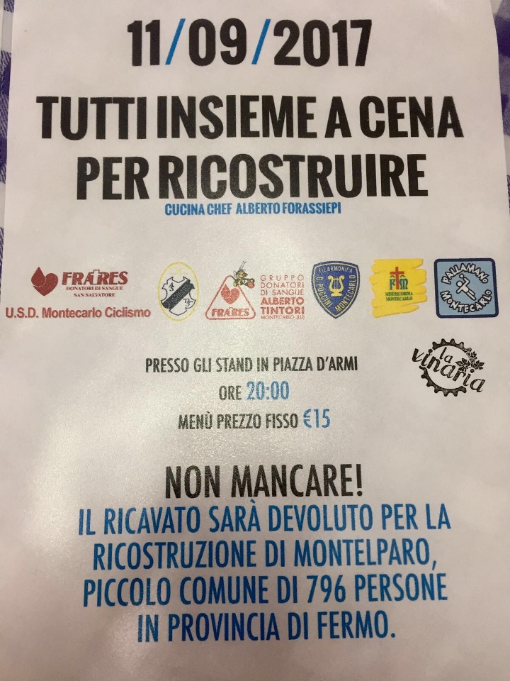 Conosciuta la situazione del post-sisma a Montelparo, con la brillante iniziativa di Roberto Lencioni, si è qui organizzata la Cena di Beneficienza che ha portato in dono, a questo sconosciuto (ai più!) paese del fermano, la considerevole cifra di 2700 euro!