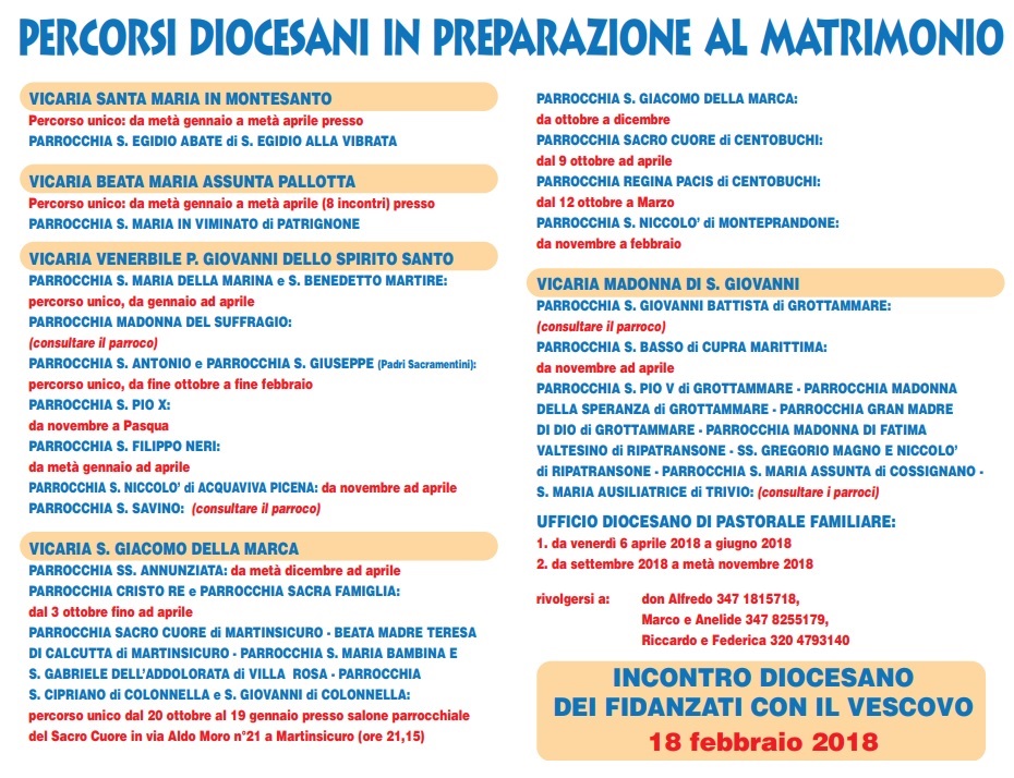 L’Ufficio consiglia, inoltre, a tutti i giovani innamorati che non hanno ancora la data del matrimonio, di partecipare ugualmente sia ai percorsi di preparazione al matrimonio sia all’Incontro Diocesano con il Vescovo che si svolgerà il 18 febbraio 2018.