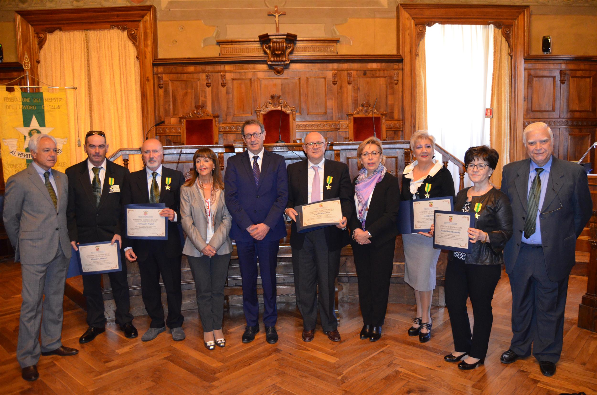 I maestri del lavoro premiati con l’attestato di riconoscimento dalla Provincia sono: Guido Bianchini di Ascoli Piceno impiegato della Cassa edile Ascoli – Fermo, Vittorio Camacci di Arquata del Tronto dipendente della Scandolara S.p.A., Maria Teresa Catalani di San Benedetto del Tronto impiegata della Conad Adriatico Scrl di Monsampolo del Tronto, Letizia Mazzitti di Folignano dipendente della Casa di Cura Villa Anna di San Benedetto del Tronto, Valentino Piergallini di San Benedetto del Tronto Direttore della Bcc Picena Truentina di Acquaviva Picena e, infine, Ferruccio Traini di Ascoli Piceno dipendente della Tim Telecom Italia di Ascoli.