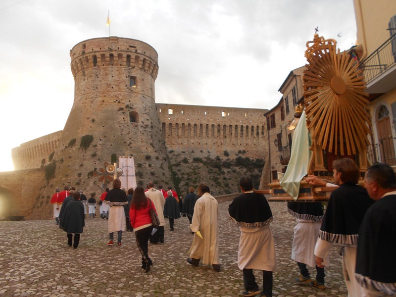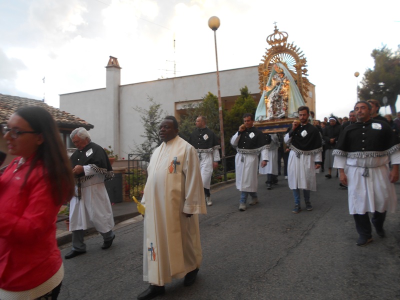 ACQUAVIVA PICENA – Ad Acquaviva Picena domenica 22 ottobre si è svolta la festa della Madonna del Rosario con lo svolgimento della santa Messa e della solenne processione, il tradizionale percorso di quest’ultima ha subito un cambiamento a causa del maltempo. Presenti tutte le Confraternite e in particolar modo quella della Madonna del Rosario, nata nel lontano 1522 ad Acquaviva con lo scopo di aiutare i bisognosi, i poveri e per provvedere alle necessità del paese, ora come ha detto il Priore Paolo Gaetani : “Le Confraternite non hanno più il ruolo che avevano un tempo”. Durante la Messa don Alfredo ha benedetto la veste di un nuovo confratello Nicolino.