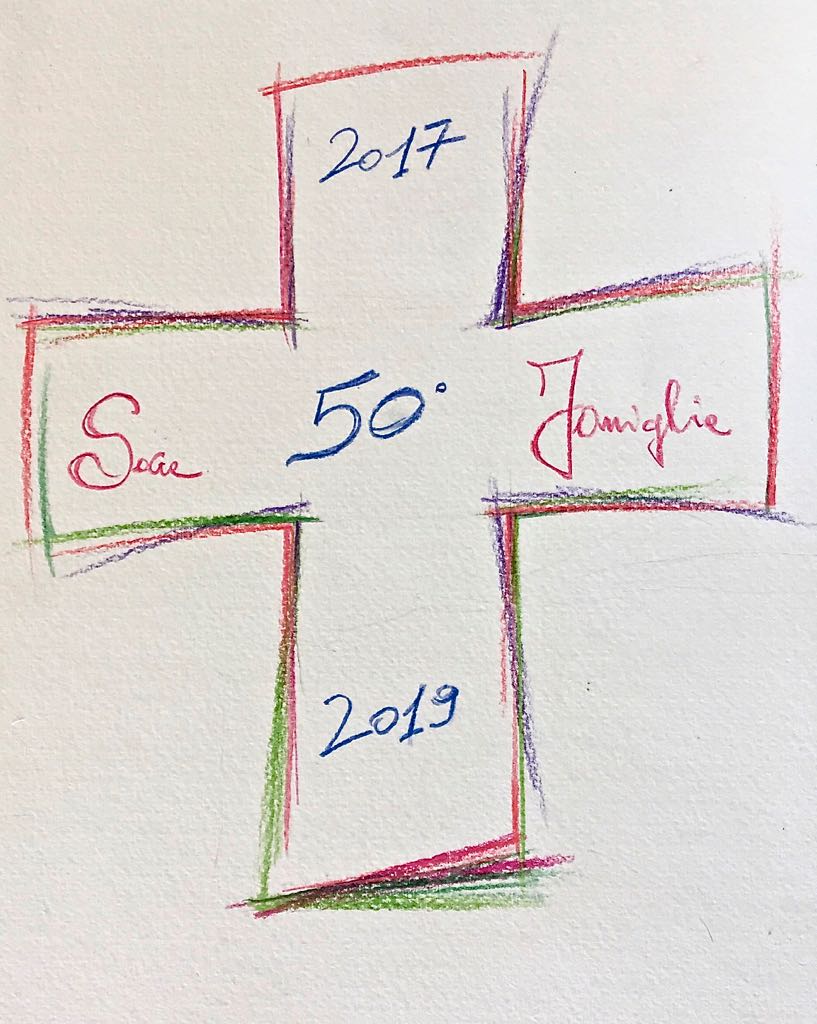 Il logo e il motto dell’anniversario parrocchiale ne offrono una sintesi felice. Una croce colorata ed un invito alla comunità a riscoprirsi “Popolo di Dio in cammino”.