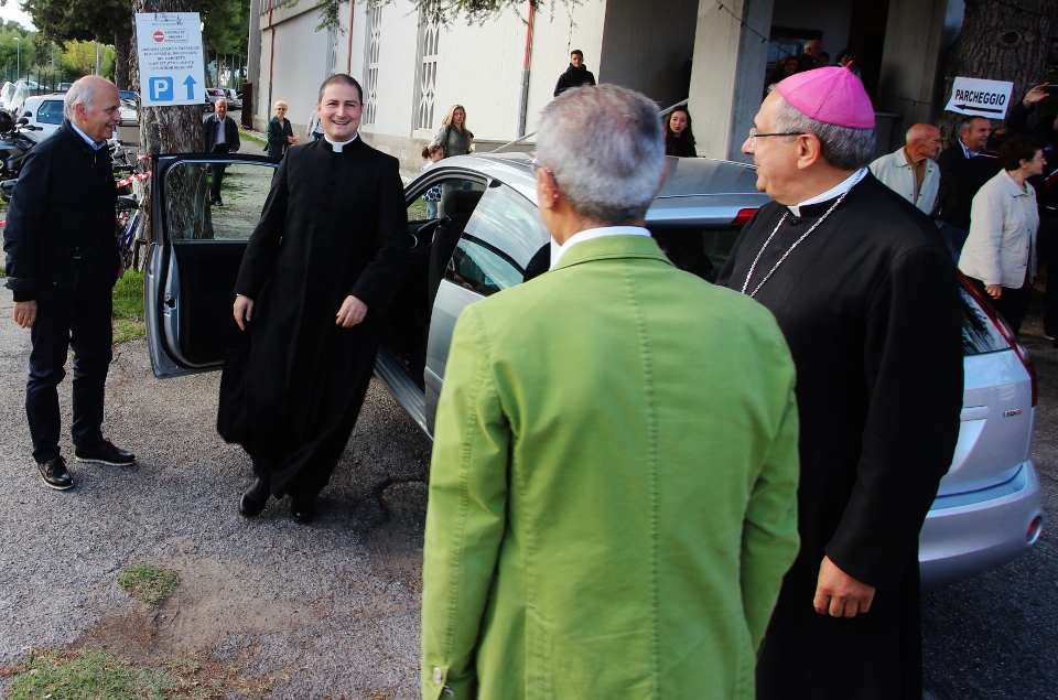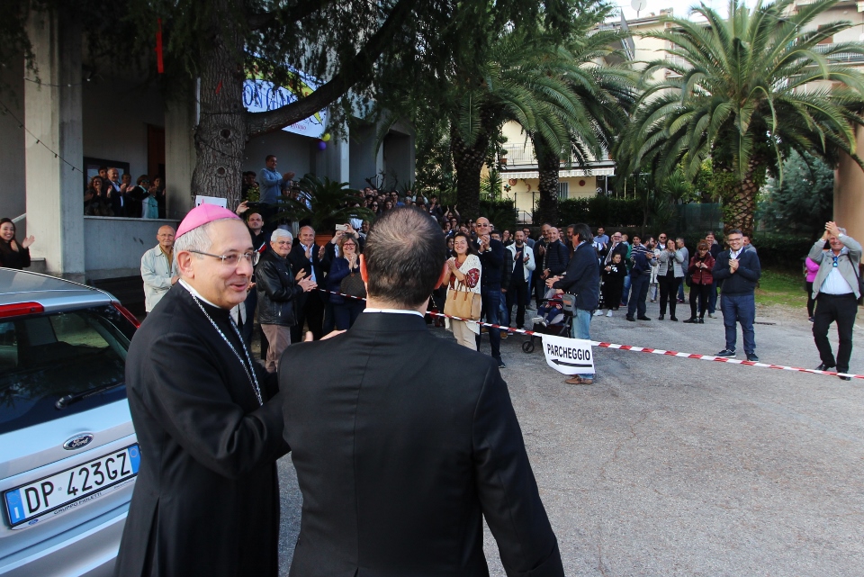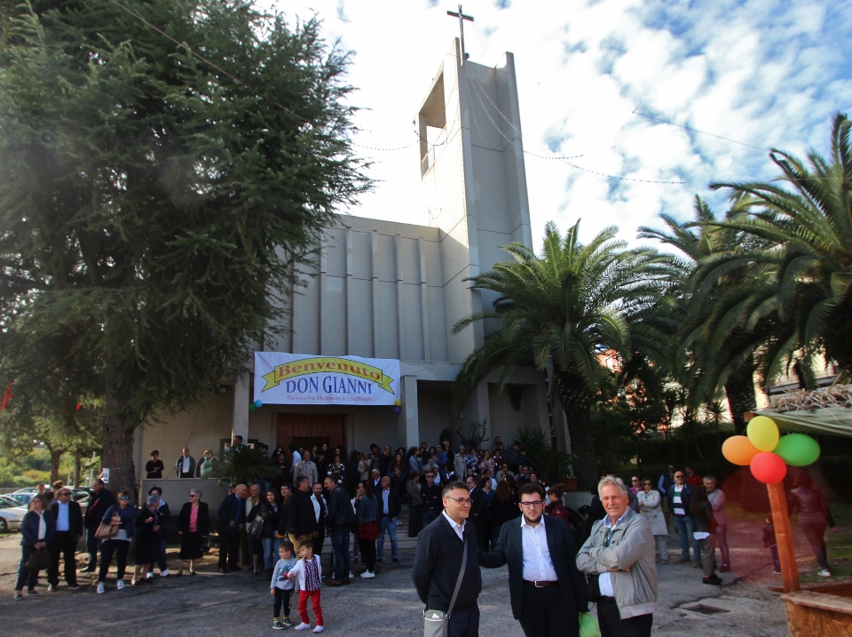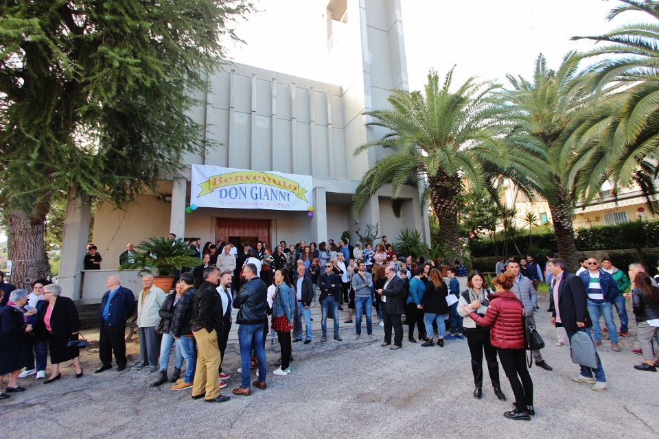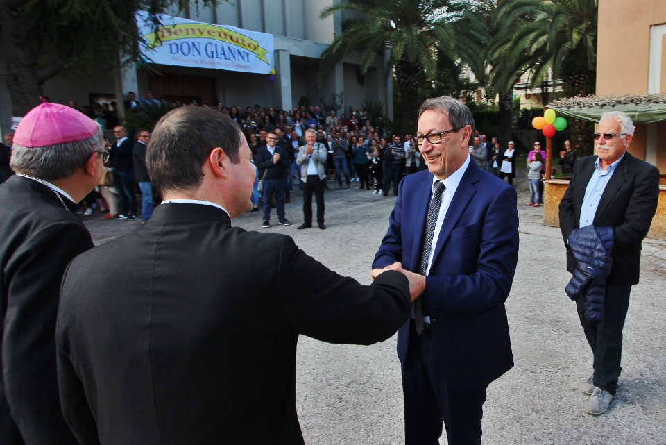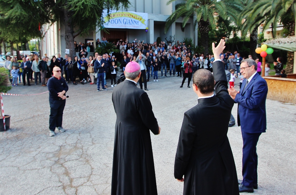 Ad accogliere Don Gianni nello spazio antistante alla Chiesa il Sindaco di San Benedetto del Tronto, Pasqualino Piunti