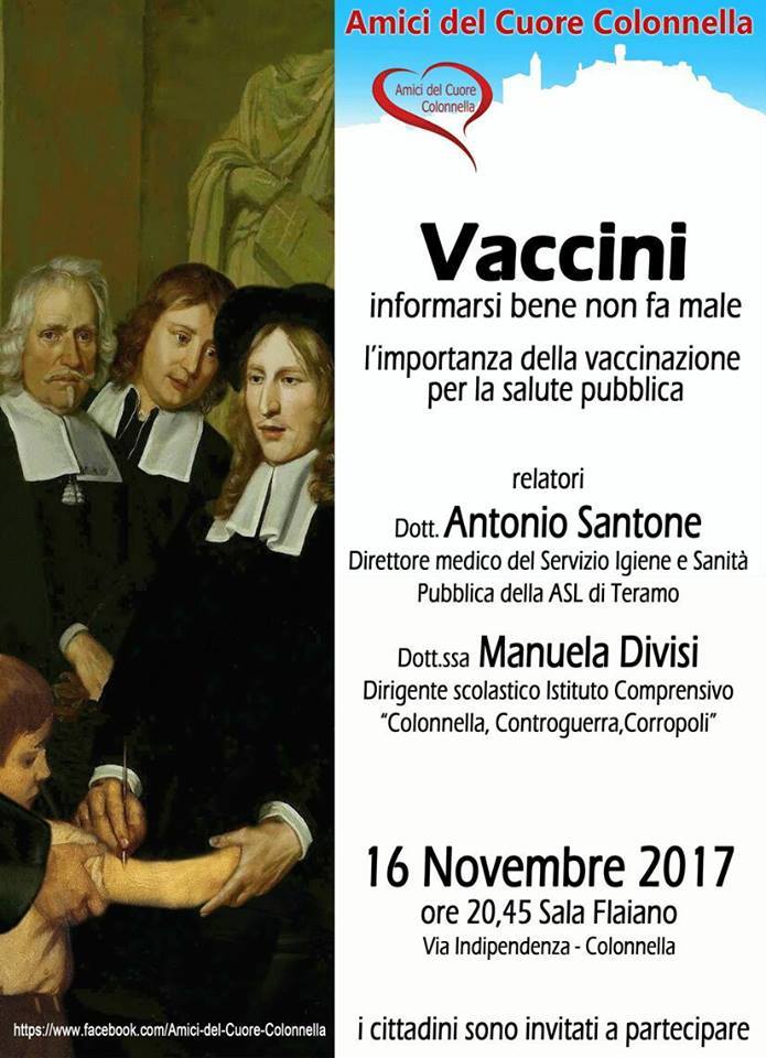 L’Associazione Amici del Cuore Colonnella, nata nel 2015, non è nuova ad iniziative in ambito sanitario: dopo aver comprato e donato al territorio colonnellese due defibrillatori, ha provveduto ad organizzare due corsi accreditati dalla regione Abruzzo per formare cittadini al loro utilizzo ed ha anche organizzato incontri sull’alimentazione. Non solo: tra le attività dell’associazione vi sono state anche giornate organizzate per i bambini, in particolare per quelli dei ragazzini dei territori terremotati ed ospitati negli alberghi della riviera lo scorso Natale. Nella serata del 16 novembre, dunque, oltre a parlare di vaccini, l’associazione presenterà anche le future attività che sta mettendo in campo per i prossimi mesi.