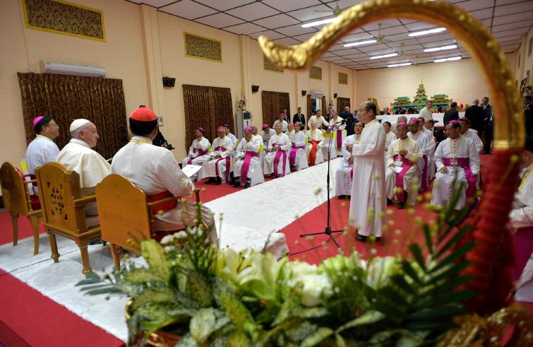 “Un buon pastore è costantemente presente nei riguardi del suo gregge, conducendolo mentre cammina al suo fianco”. Così il Papa, incontrando i vescovi del Myanmar, ha declinato la seconda parola-chiave del suo discorso: “Accompagnamento”. “Il pastore dovrebbe avere l’odore delle pecore”, ha ribadito il Papa, ma “anche l’amore di Dio”, ha aggiunto a braccio: “Ai nostri giorni siamo chiamati a essere una Chiesa in uscita per portare la luce di Cristo ad ogni periferia”. “In quanto vescovi, le vostre vite e il vostro ministero sono chiamati a conformarsi a questo spirito di coinvolgimento missionario, soprattutto attraverso visite pastorali regolari alle parrocchie e alle comunità che formano le vostre Chiese locali”, la consegna di Francesco: “È questo un mezzo privilegiato per accompagnare, come padri amorevoli, i vostri sacerdoti nel loro impegno quotidiano a far crescere il gregge in santità, fedeltà e spirito di servizio”. “Siate vicini ai sacerdoti”, ha detto ancora a braccio: “Non dimenticate che il prossimo più prossimo, per un vescovo, è il sacerdote. Che ogni sacerdote non solo sappia, ma senta che ha un padre nel vescovo”. “Continuate a permeare il laicato nello spirito di un autentico discepolato missionario e a ricercare una sapiente inculturazione del messaggio evangelico nella vita quotidiana e nelle tradizioni delle vostre comunità locali”, l’altra esortazione del Papa, secondo il quale “il contributo dei catechisti è al riguardo essenziale; il loro arricchimento formativo deve rimanere per voi una priorità”. “Non dimenticate che i catechisti sono i pilastri di ogni organizzazione”, ha aggiunto a braccio. Francesco ha chiesto, infine, ai vescovi birmani “un impegno speciale nell’accompagnare i giovani”: “Occupatevi della loro formazione ai sani principi morali che li guideranno nell’affrontare le sfide di un mondo in rapido cambiamento”. “Anche le sfide di un mondo minacciato dalle colonizzazioni ideologiche e culturali”, ha aggiunto a braccio. “Il prossimo Sinodo dei vescovi – ha poi ricordato – non solo riguarderà tali aspetti, ma interpellerà direttamente i giovani, ascoltando le loro storie e coinvolgendoli nel comune discernimento su come meglio proclamare il Vangelo negli anni a venire”. “Una delle grandi benedizioni della Chiesa in Myanmar è la sua gioventù e, in particolare, il numero di seminaristi e di giovani religiosi”, ha fatto notare Francesco: “Nello spirito del Sinodo, per favore, coinvolgeteli e sosteneteli nel loro percorso di fede, perché sono chiamati, attraverso il loro idealismo ed entusiasmo, a essere evangelizzatori gioiosi e convincenti dei loro coetanei”.