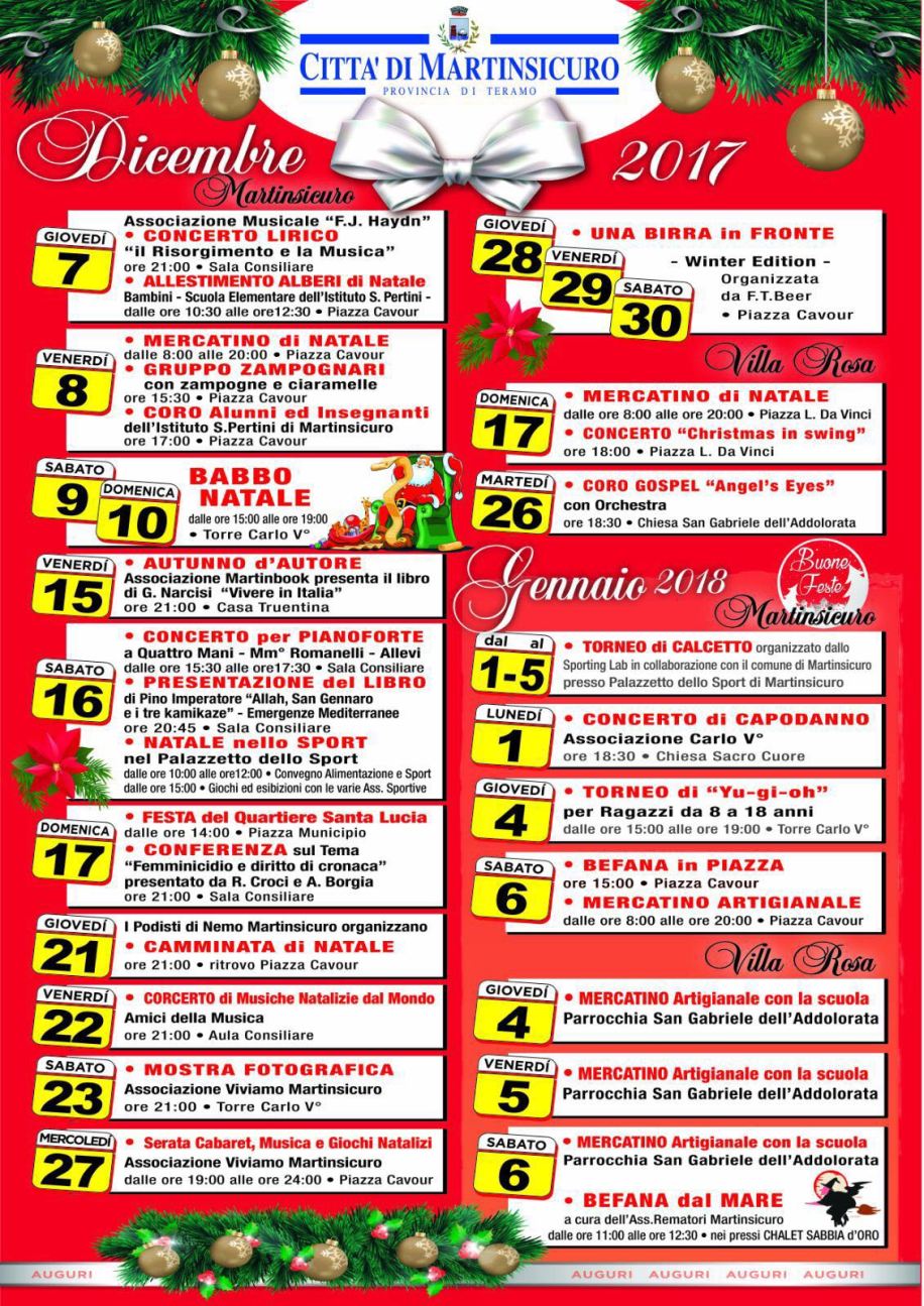 “La caratteristica principale del nostro cartellone natalizio sarà la varietà degli eventi che, ne siamo certi, andrà incontro ai gusti di tutti: per i più piccoli ci sarà la stupenda Casa di Babbo Natale, ma anche tanti appuntamenti di gioco, spettacoli, teatro ed animazioni varie, numerosi gli appuntamenti con la musica sacra, classica ed il gospel, i mercatini di Natale e dell’antiquariato, teatro, animazione, cabaret, ma anche numerosi eventi sportivi, grazie alla collaborazione delle associazioni sportive truentine, feste a tema e presentazioni di libri. Insomma – concludono il Sindaco di Martinsicuro, Massimo Vagnoni, il Vice-Sindaco ed Assessore alla Cultura, Pinuccia Camaioni, ed il Consigliere delegato al Commercio, Riccardo Fedeli – un calendario ricco, pieno di appuntamenti tutte le settimane e che, ci auguriamo, richiamerà a Martinsicuro e Villa Rosa tanti visitatori per queste festività natalizie”.