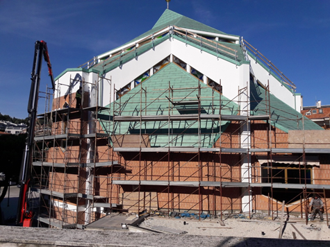 I muratori stanno invece ripulendo le varie pareti, anche le più alte, a 26 metri, dalle pitture precedenti e dai danni arrecati dalle varie piogge. È il primo passaggio che faremo con la pittura che verrà realizzata con quattro tonalità di giallo. Anche la struttura portante, fino ad oggi color cemento, sarà schiarita per dare luminosità alla nostra chiesa.