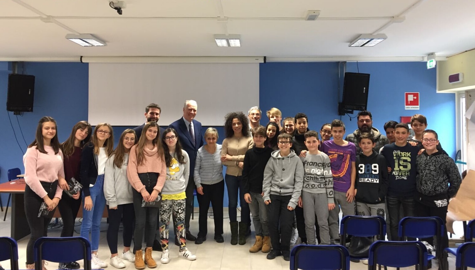 Al dirigente scolastico Ado Evangelisti è stata consegnata una copia per ciascun plesso afferente all’ISC Sud, rappresentato in questa circostanza da una classe quinta elementare del plesso “Alfortville” e da una terza media del plesso “Cappella”.