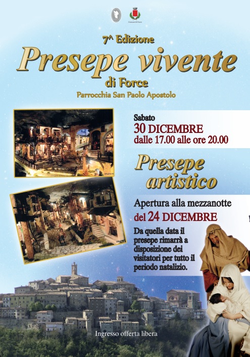 Il secondo appuntamento, molto atteso, riguarda invece il Presepe Vivente che la città di Force si appresta a vivere nella sua settimana edizione. L’appuntamento è fissato per sabato 30 dicembre dalle ore 17.00 alle ore 20.00