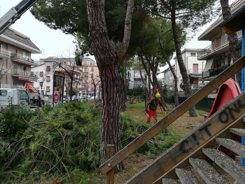 I lavori sono partiti nella pineta di via Leonardo Da Vinci in questi giorni: per quell’area verde, l’ufficio Manutenzioni aveva previsto la potatura di 24 pini domestici (v. foto).