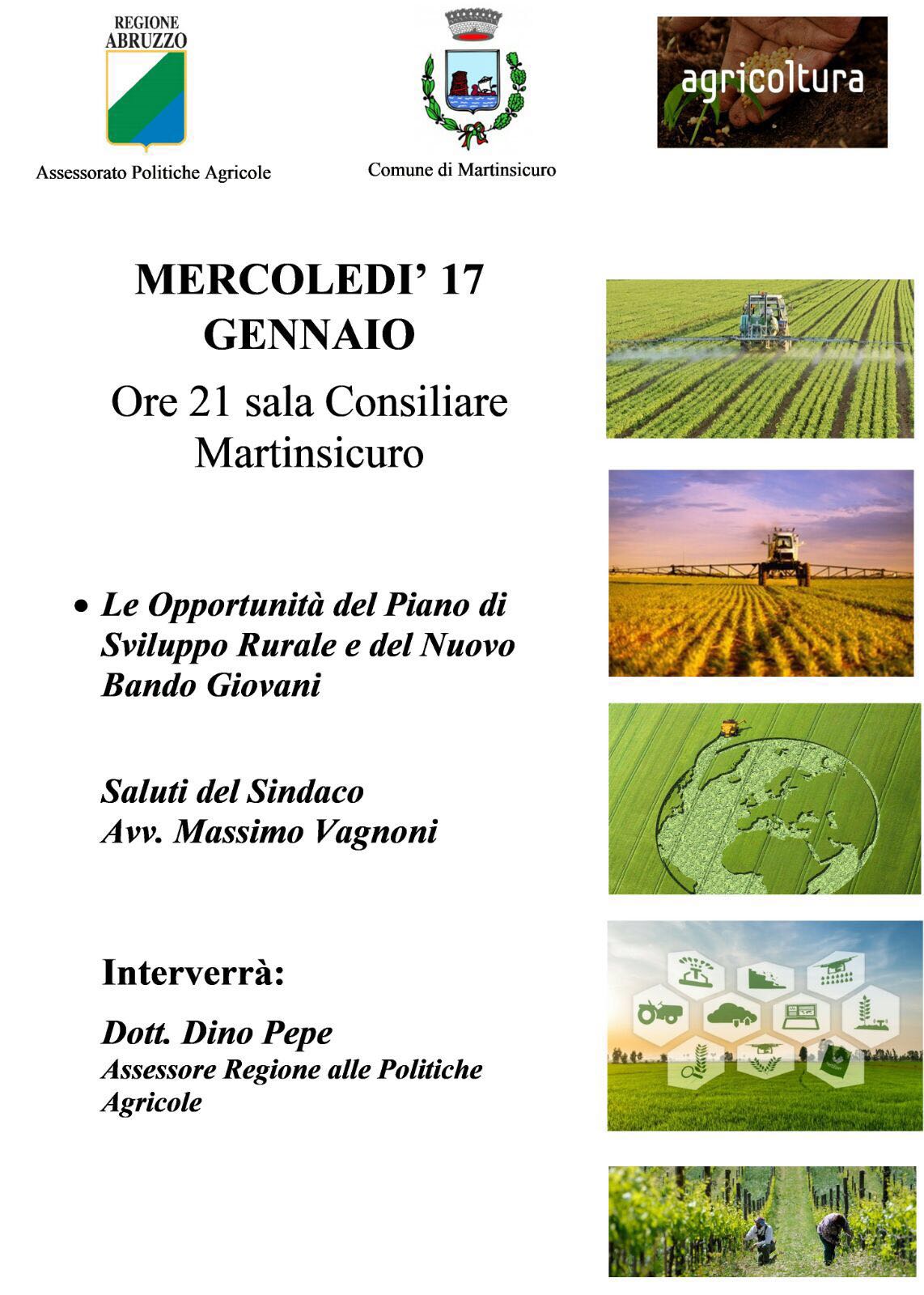 Mercoledì 17 gennaio dalle ore 21:00 presso la Sala Consiliare del Comune di Martinsicuro si svolgerà un incontro pubblico per illustrare alla cittadinanza “Le opportunità del Piano di Sviluppo Rurale e del Nuovo Bando Giovani”. L’appuntamento, organizzato dal Comune di Martinsicuro e dall’Assessorato alle Politiche Agricole della Regione Abruzzo, vedrà i saluti del primo cittadino truentino, Massimo Vagnoni, e l’intervento dell’Assessore regionale alle Politiche Agricole, Dino Pepe.