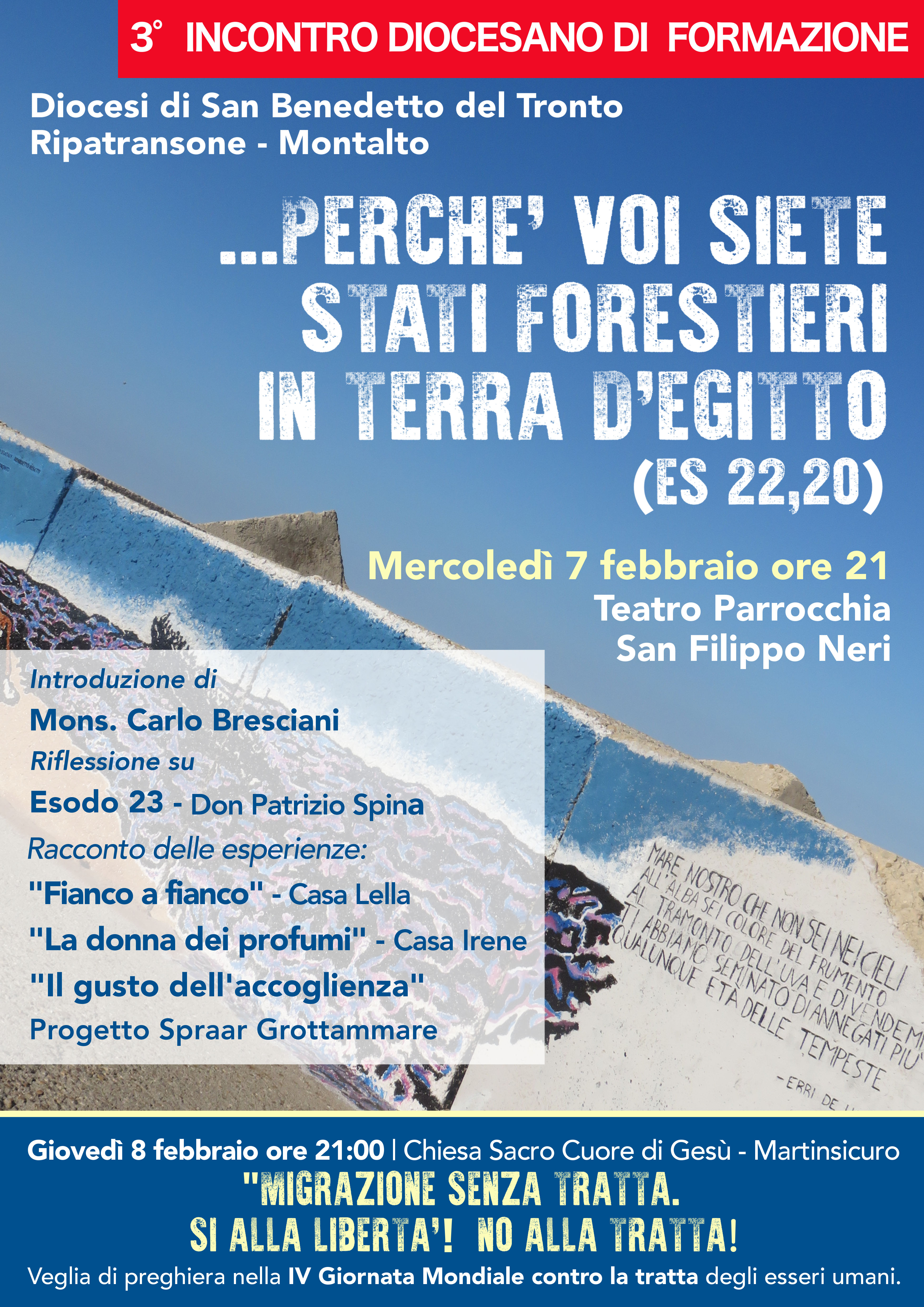 DIOCESI – Mercoledì 7 febbraio 2018 alle ore 21.00 presso il teatro della Parrocchia di S. Filippo Neri a S. Benedetto del Tronto si terrà il terzo incontro formativo diocesano per tutto il popolo di Dio ed in modo particolare gli operatori pastorali e le realtà ecclesiali per approfondire, a partire dal libro dell’Esodo, il tema dell’immigrazione.