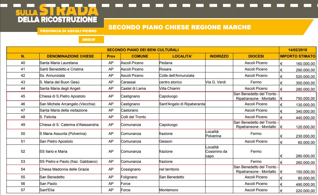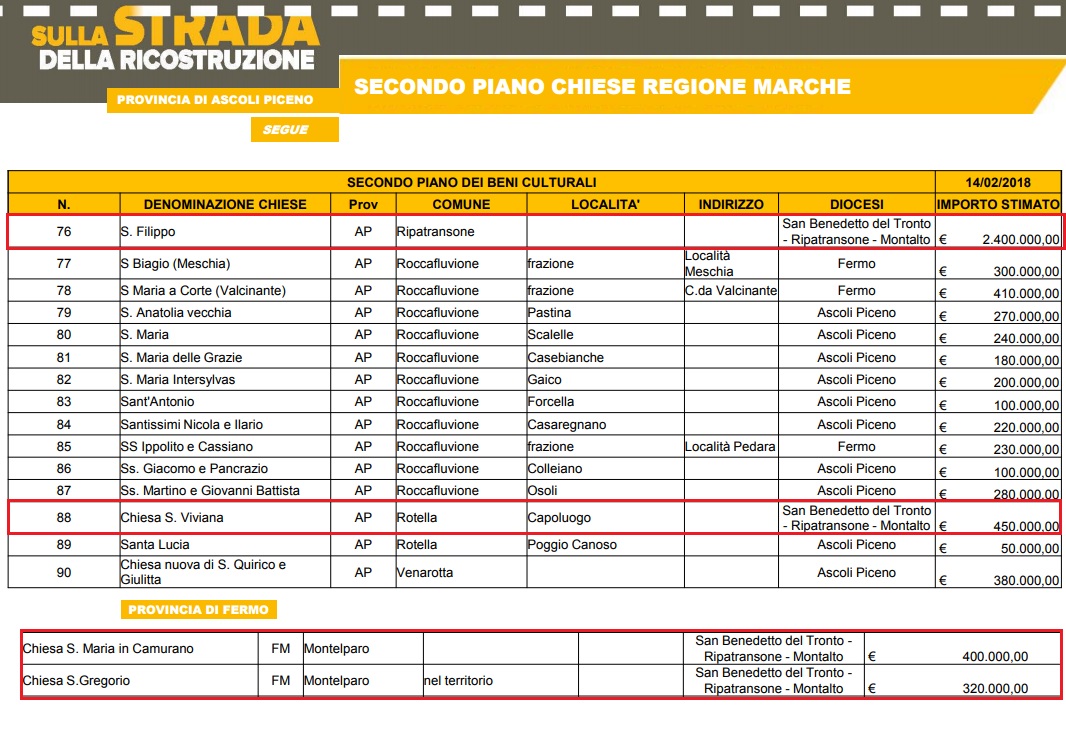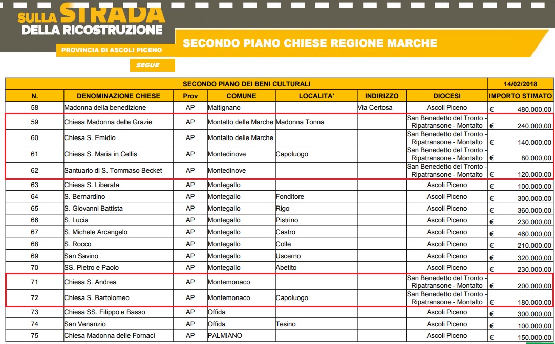 Le chiese interessate, di proprietà delle Diocesi, ricadono nei comuni di Acquasanta Terme (14), Appignano del Tronto (1), Arquata del Tronto (11), Ascoli Piceno (16), Carassai (1), Castel di Lama (1), Castignano (2), Castorano (1), Colli del Tronto (1), Comunanza (5), Cossignano (1), Folignano (1), Force (2), Maltignano (1), Montalto delle Marche (2), Montedinove (2), Montegallo (8), Montemonaco (2), Offida (2), Palmiano (1), Ripatransone (1), Roccafluvione (11), Rotella (2), Venarotta (9).