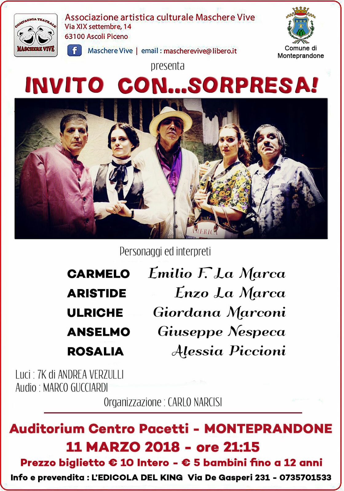 MONTEPRANDONE – Grande successo in tutta Italia per la commedia “Maschere Vive” liberamente ispirata ad una farsa napoletana di Peppino De Filippo, diretta da Emilio Fabrizio La Marca e noto al grande pubblico. Si tratta di una divertente rappresentazione che trasformerà il viaggiò di nozze di Carmelo e Rosalia in una esilarante avventura presso l’abitazione del marchese Aristide. Nei panni di Aristide, Enzo La Marca, nei panni di Carmelo, Emilio F. La Marca, Alessia Piccioni è Rosalia, Giordana Marconi è Ulriche ed infine Anselmo è Giuseppe Nespeca.