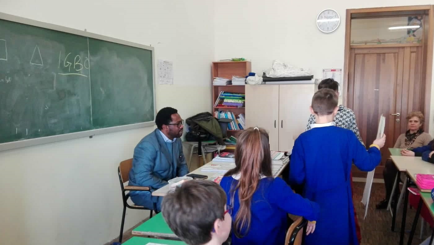 Don Vincent: Sono nato in Nigeria nell’Africa Occidentale (Don Vincent da bravo professore con una bacchetta ci mostra sulla cartina dov’è situata la Nigeria). È’ una colonia inglese e lì si parlano 250 lingue. Con i suoi 170 milioni di abitanti è il paese più popolato dell’Africa. La lingua che parlavo da piccolo nel mio territorio è “IGBO” (ce l’ha scrive alla lavagna), la lingua inglese è imposta alla popolazione e si impara già alla scuola dell’infanzia. Sono venuto in Italia nel 1997 grazie ad una borsa di studio sono venuto a studiare a Roma, però sono andato prima ad Urbino per un corso intensivo di italiano. Durante l’estate andavo all’estero sono stato a Vienna poi in Germania per imparare il tedesco.