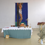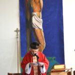 La cerimonia è stata condotta da un brillantissimo Padre Giovanni Guerrino Mazzoni, vice-parroco della Parrocchia di San Michele Arcangelo. Egli ha benedetto gli ulivi, che ogni fedele innalzava verso il cielo, proprio davanti alla Chiesa di San Gregorio Magno. Da qui si è snodata una processione che ha portato i fedeli all’interno della palestra comunale dove tutto era pronto per quella che sarebbe stata una bellissima cerimonia sottolineata dai canti della Corale Petrocchini! Dietro all’altare spiccava un bellissimo acquerello su tela: “Gesù Cristo in Croce”! Opera dell’artista, padre Salvatoriano, Colombiano Juan Josè Carasquilla, è stata recentemente donata alla Parrocchia!
